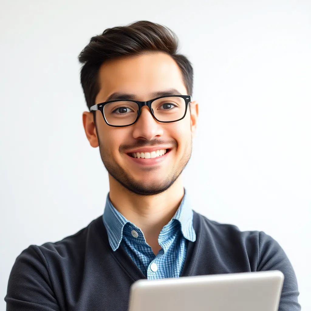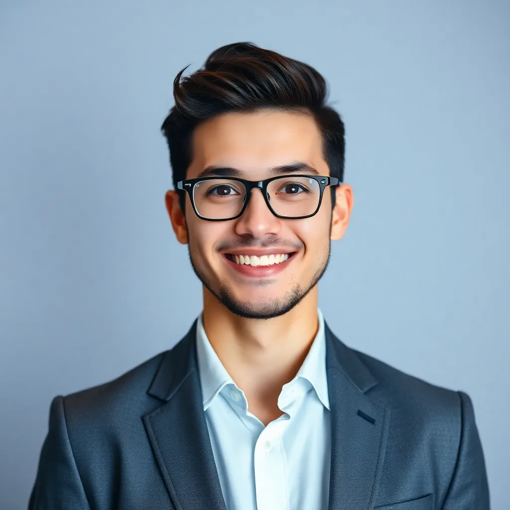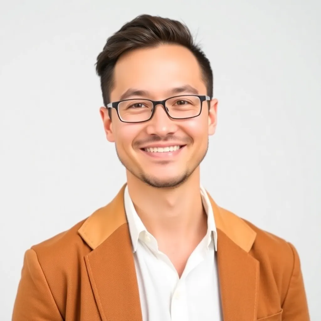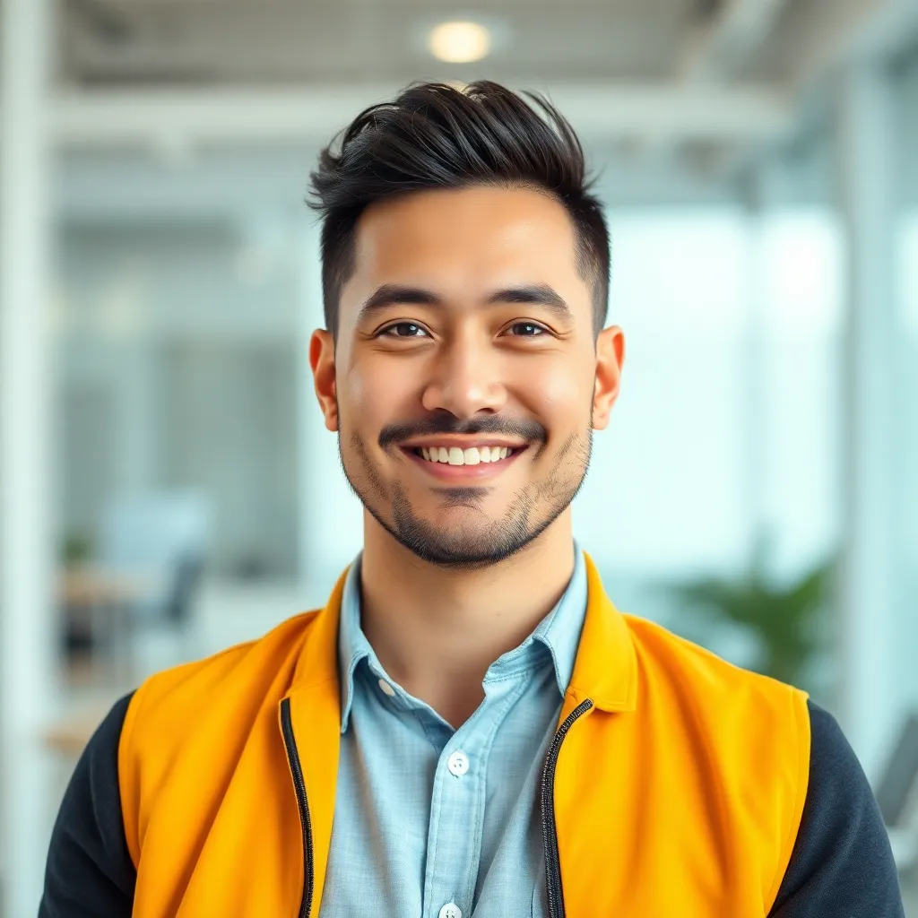 Create a modern and professional headshot for a startup founder, showcasing confidence and approachability. Imagine a warm-toned, well-lit studio setting with a crisp white background. The founder, a young professional with a friendly smile, is dressed in a simple yet stylish outfit, with a subtle nod to their industry.