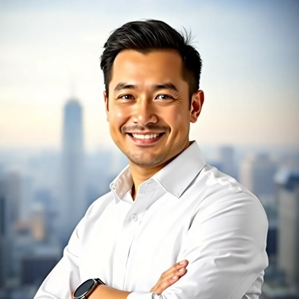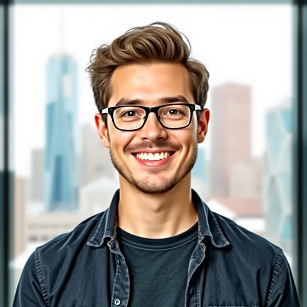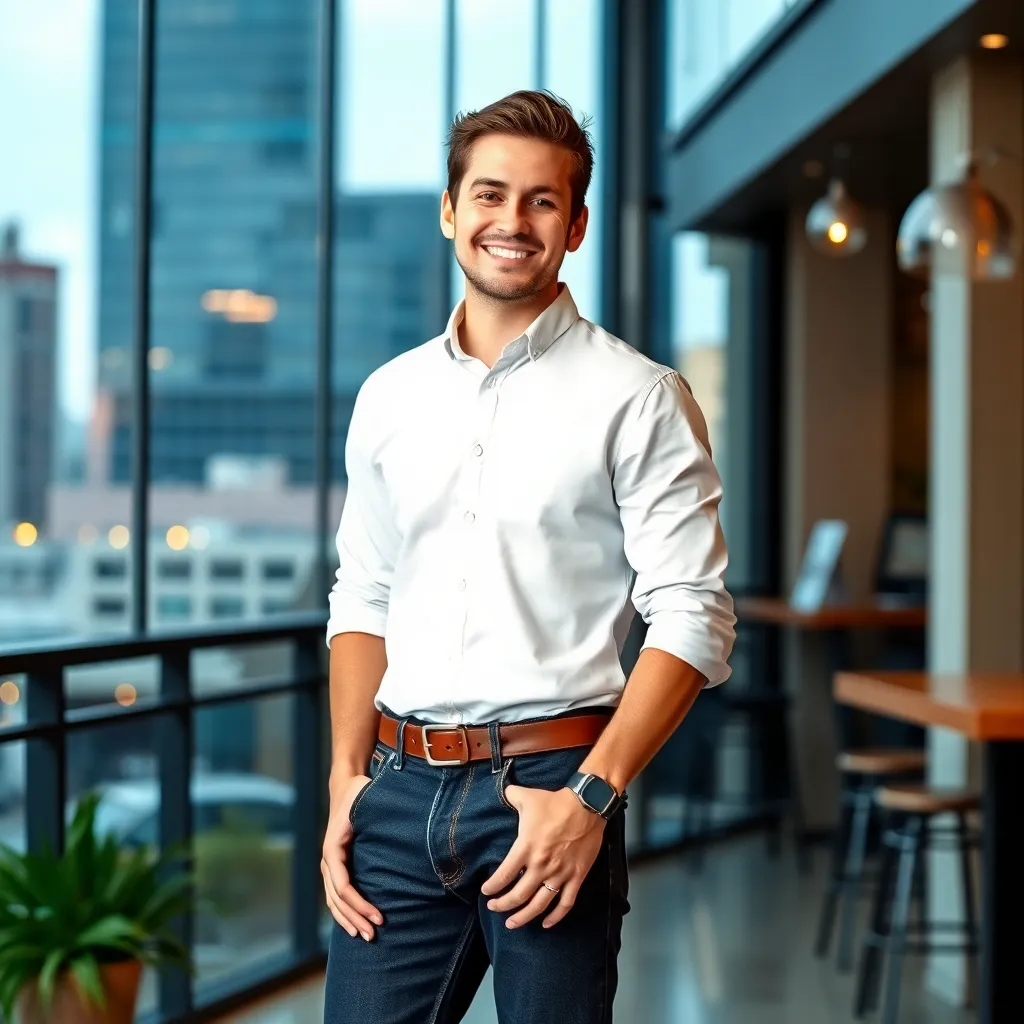 Create a professional startup founder headshot. Imagine a successful entrepreneur in their mid-30s, with a friendly yet assertive expression. They're wearing a crisp white shirt, dark jeans, and a simple yet stylish watch. The background is a subtle, modern cityscape. Style the image with a hint of creativity and confidence.