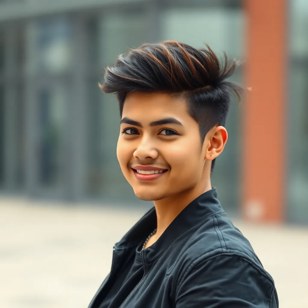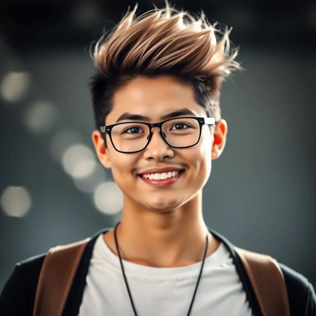 A dynamic, high-contrast image featuring a confident, approachable individual with a modern, trendy hairstyle and attire. Include a subtle background blur to emphasize the subject. Consider incorporating a hint of startup-related props, such as a laptop or notebook, to convey entrepreneurial spirit.