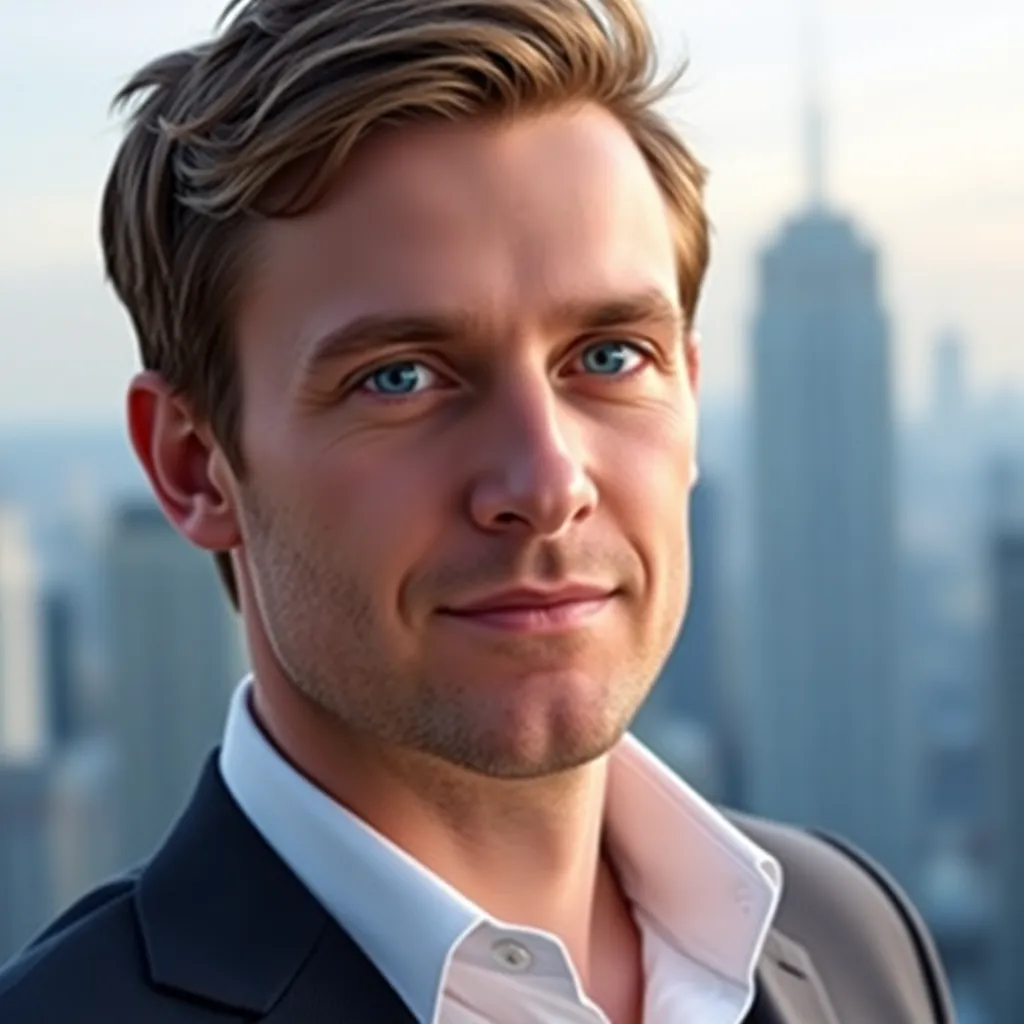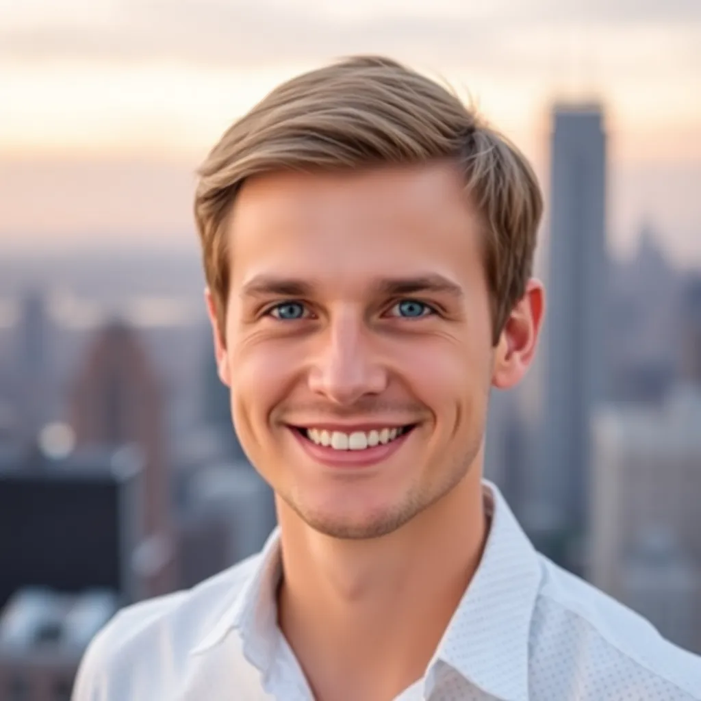 Create a professional startup founder headshot. The entrepreneur is a 35-year-old male with short brown hair and bright blue eyes. He's wearing a crisp white shirt and a blazer. He's standing in front of a city skyline with a subtle gradient effect. The overall mood is modern, confident, and innovative.