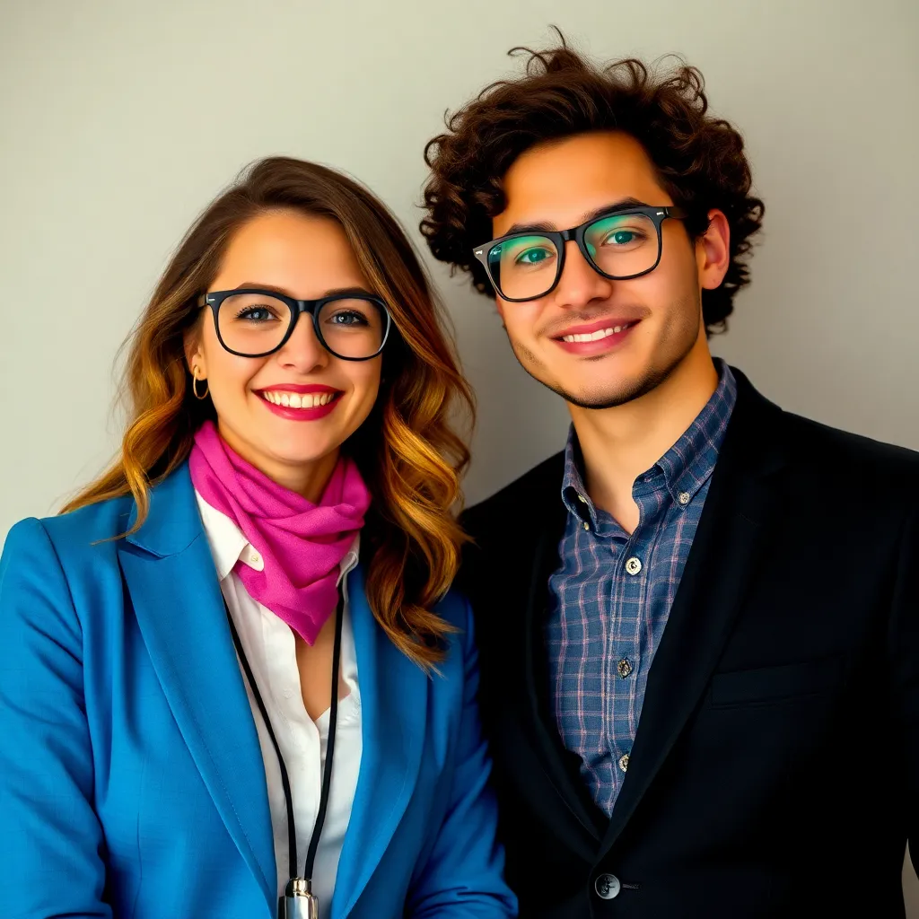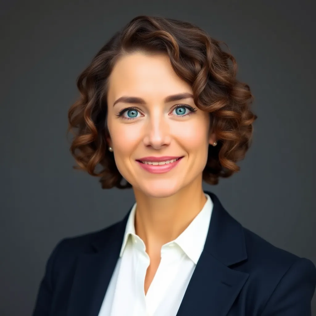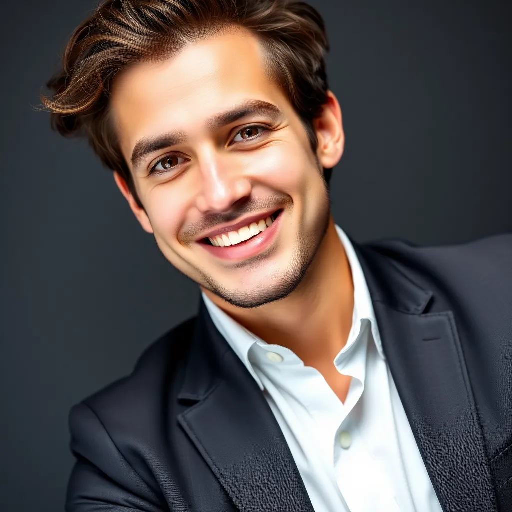 Create a professional headshot for a startup founder, showcasing a bright and ambitious individual with a warm smile. Imagine a 30-something-year-old entrepreneur with a sharp jawline, piercing brown eyes, and a stylishly messy hairdo. Dress in a crisp white shirt and a bold, contrasting blazer for a striking visual.