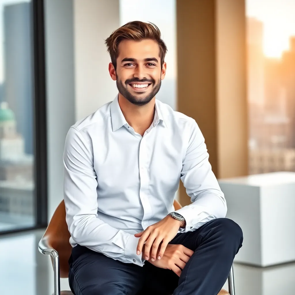 Capture the essence of a startup founder's personality and professionalism with a high-quality headshot. Imagine a modern, minimalist background with the founder sitting or standing confidently, dressed in business casual attire, and exuding a sense of innovation and entrepreneurial spirit. Use this prompt to generate a realistic AI image.