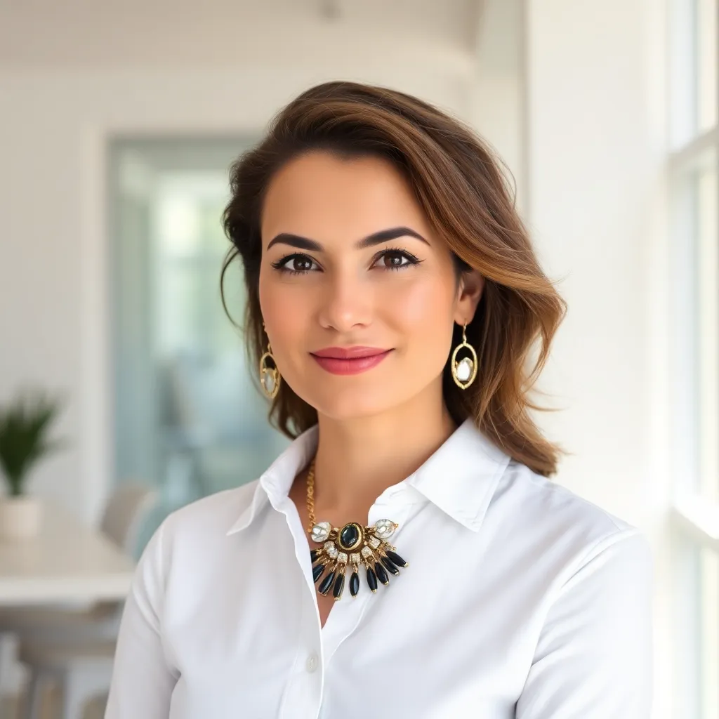 Capture the essence of a startup founder's personality and professionalism in a single headshot. Imagine a bright and modern setting, with a person dressed in a crisp white shirt and a bold statement piece of jewelry. The lighting is soft and natural, accentuating the subject's confident and innovative spirit.
