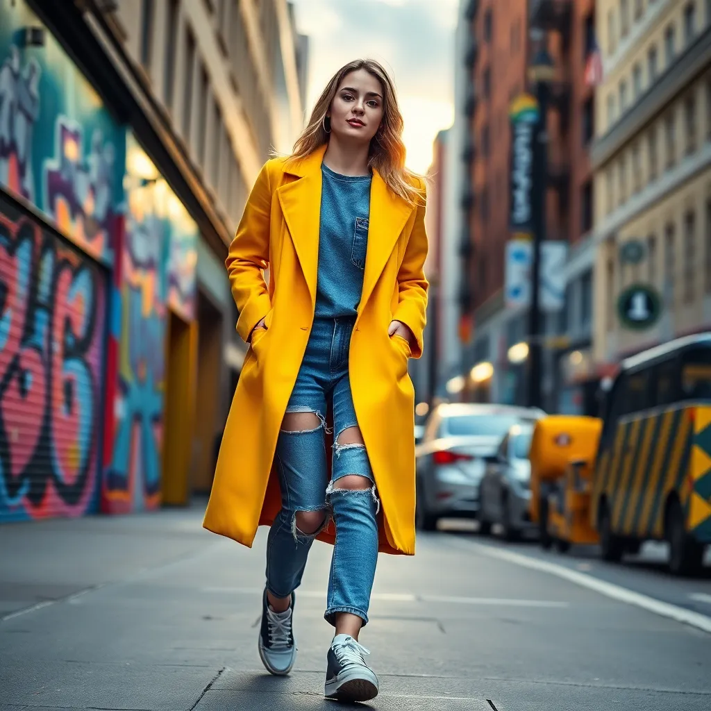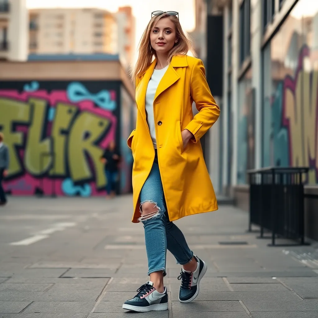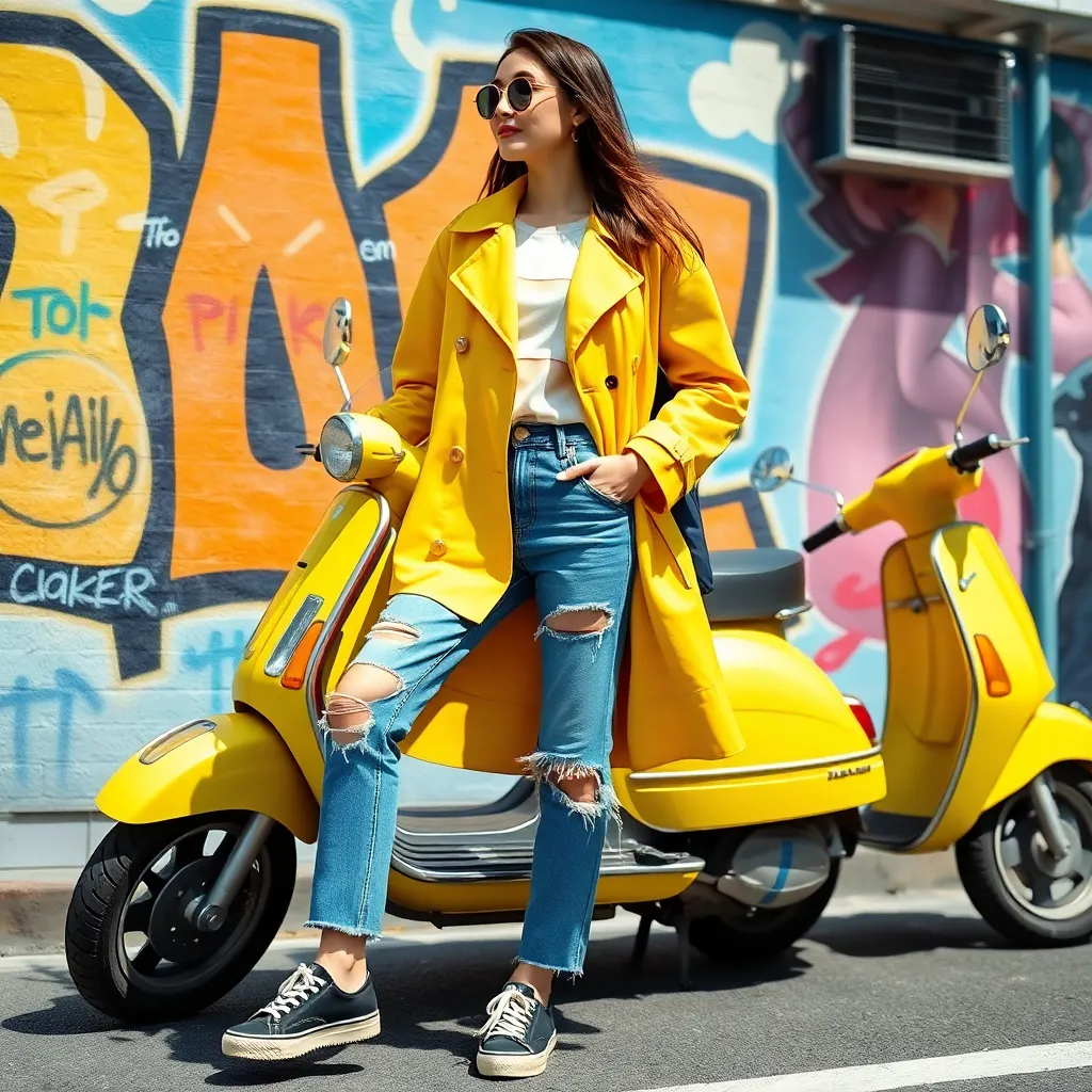 Capture the essence of a trendy urbanite on a sunny Saturday afternoon in Tokyo. Imagine a 25-year-old fashion enthusiast, donning a bold yellow trench coat, distressed denim jeans, and statement-making sneakers. The backdrop is a vibrant street art wall in the Harajuku district, with a vintage Vespa scooter parked nearby.