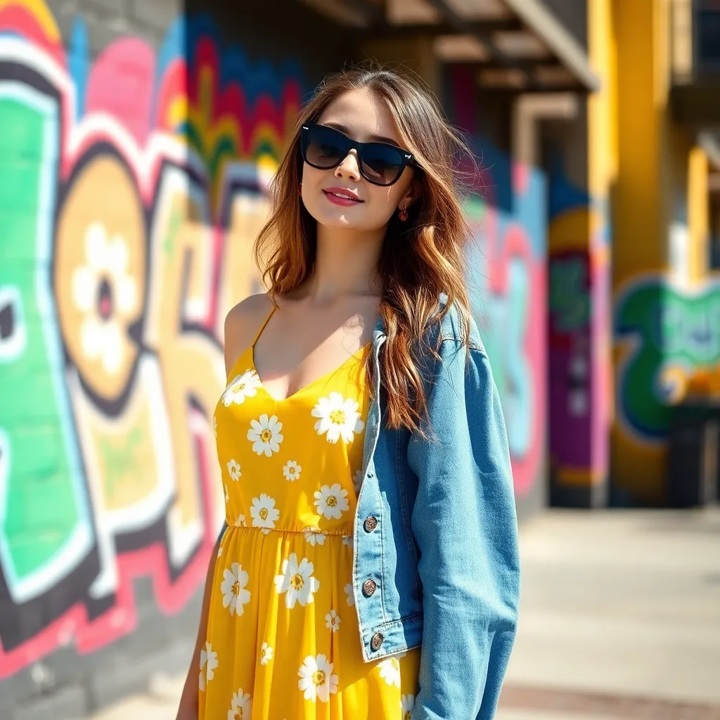 Create a captivating street style image of a trendy young woman walking down a vibrant city street. She's wearing a bold, oversized denim jacket over a bright yellow sundress, paired with white sneakers and a statement gold necklace. Capture the essence of urban chic and summertime cool in this image.