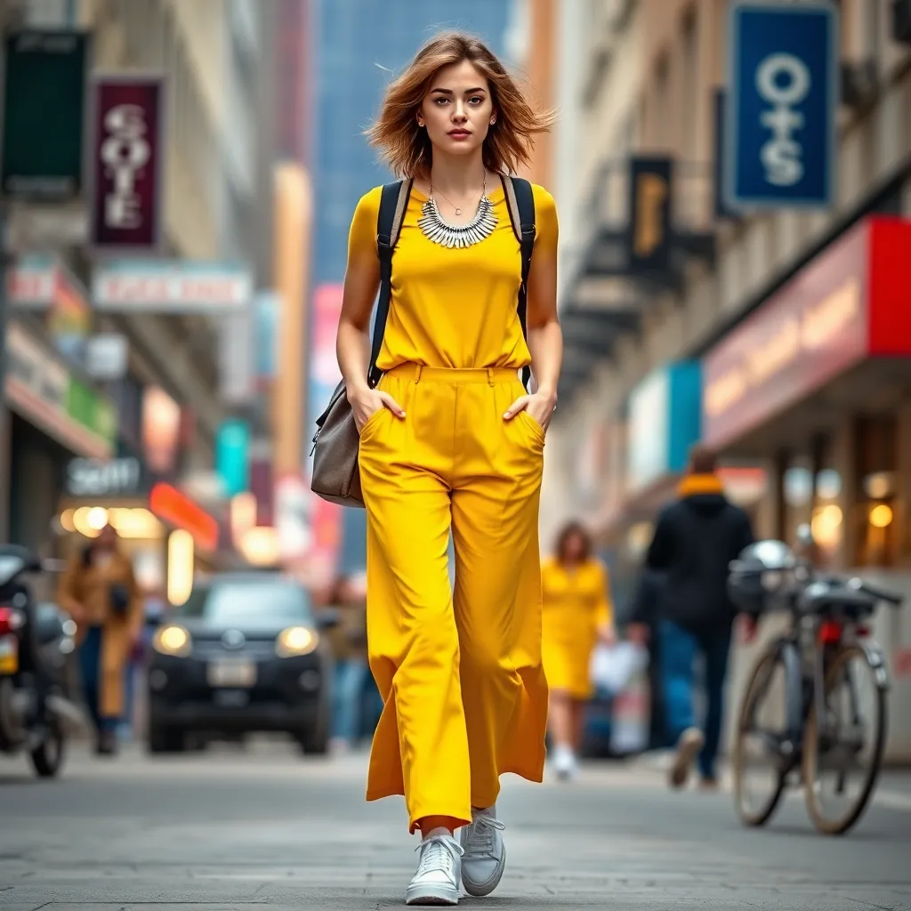 Create a stunning street style image of a trendy young woman walking down a bustling city street. She's wearing a bold, bright yellow jumpsuit with flared legs, paired with chunky white sneakers and a statement silver necklace. Her hair is styled in messy waves, and she's carrying a vintage-inspired backpack.