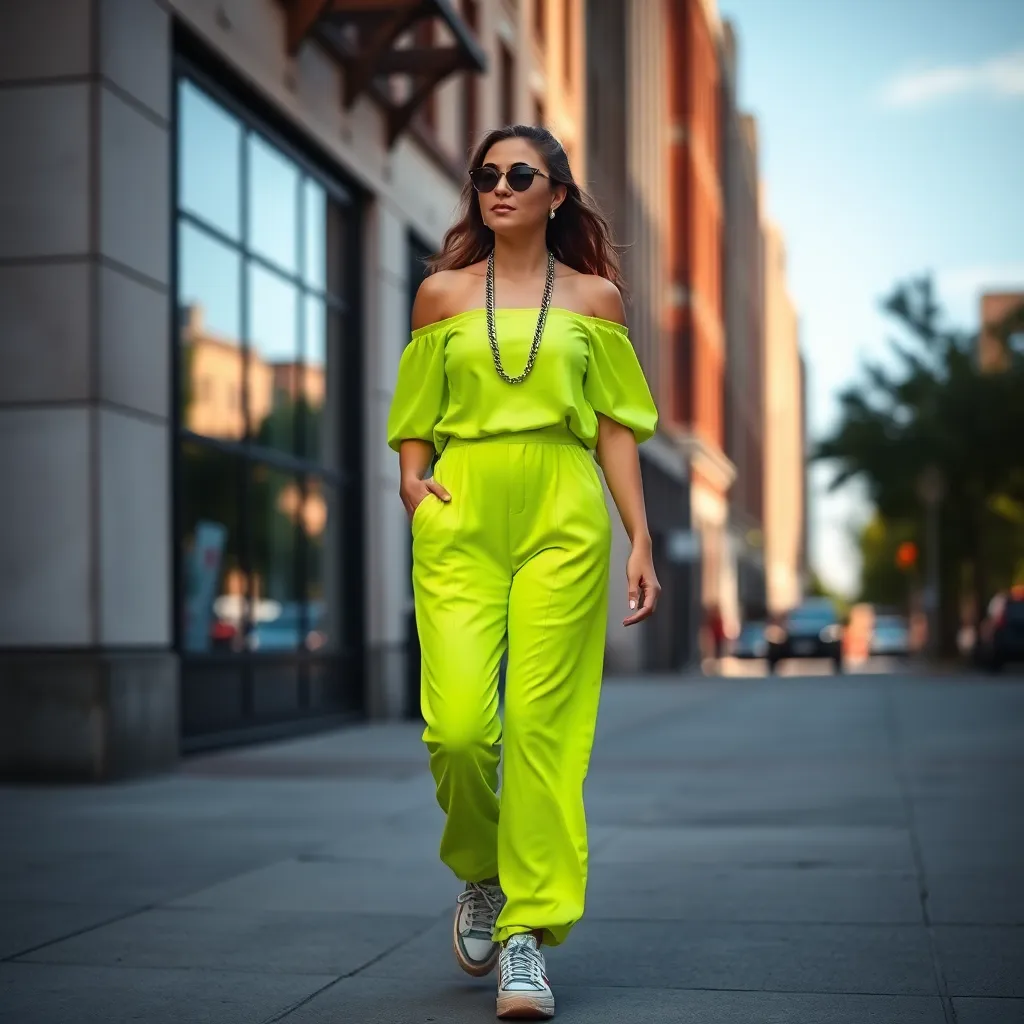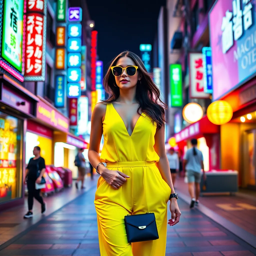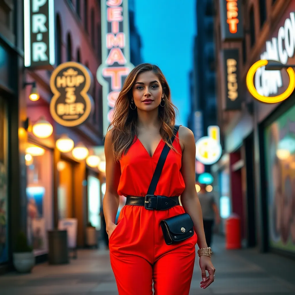 Capture the essence of a trendy evening stroll in the city. A stylish young woman, dressed in a bold, neon-lit jumpsuit, walks down a bustling street lined with neon signs and street art. Her outfit is accessorized with a chunky belt bag and statement earrings. The city lights reflect off her shiny hair.