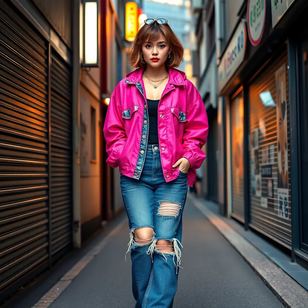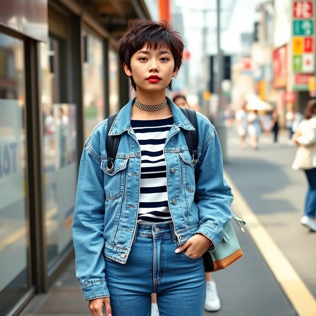 Capture the essence of a trendy afternoon in Tokyo's Harajuku district. A young woman, 22, with short, spiky hair and bold red lipstick, wears a distressed denim jacket over a striped Breton shirt, high-waisted mom jeans, and white chunky sneakers. Add a statement silver choker and a retro-inspired backpack.