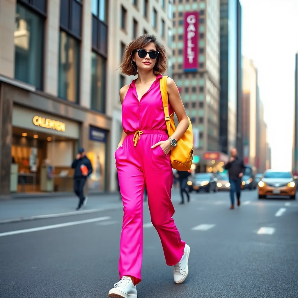Create a vibrant street style image of a young woman walking down a bustling city street. She's wearing a bold, neon pink jumpsuit with a matching hat and chunky sneakers. Her hair is styled in messy, effortless waves and she's carrying a vintage-inspired handbag. The background is a mix of sleek skyscrapers and graffiti-covered walls.