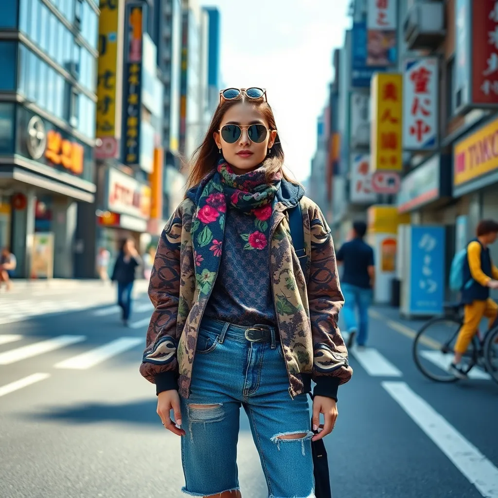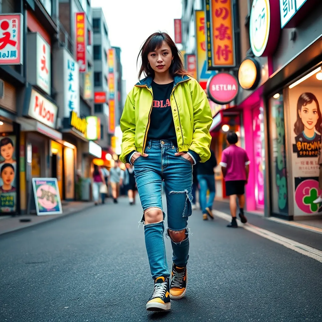Capture the essence of a trendy afternoon in Tokyo's Harajuku district. A 20-year-old fashionista, Akira, is strolling down Takeshita Street, wearing a bold, neon-lit outfit featuring a cropped jacket, high-waisted distressed denim, and statement sneakers. The background is a vibrant mix of street art and eclectic shops.