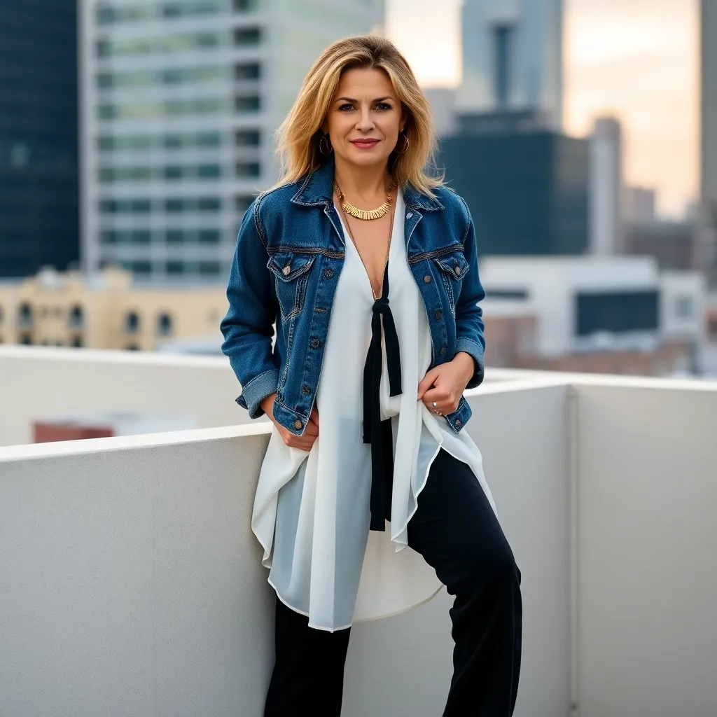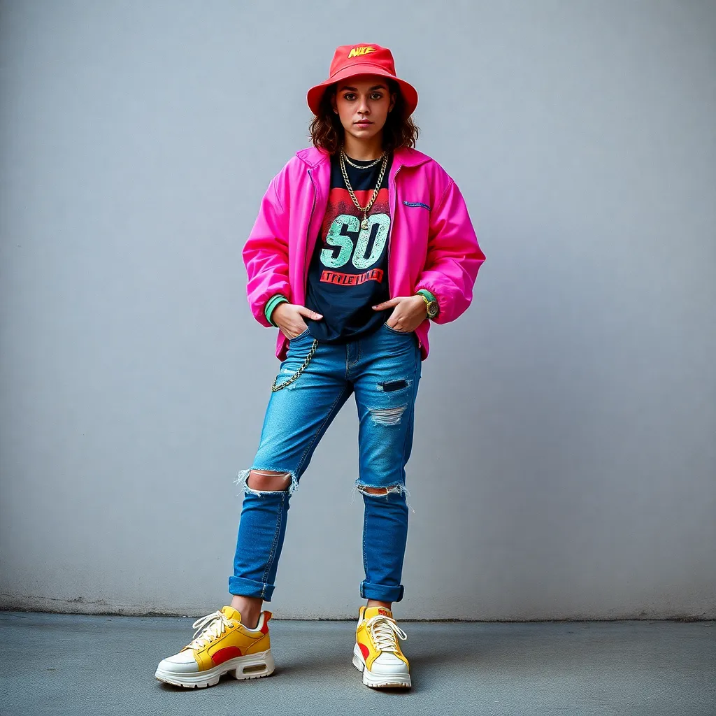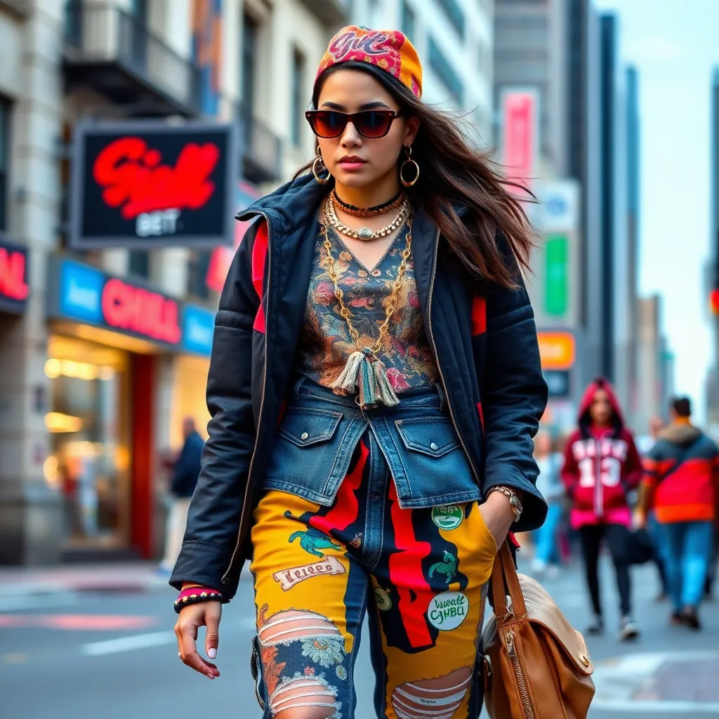 Capture the essence of a trendy city dweller on a sunny Saturday afternoon. Imagine a stylish individual wearing distressed denim, a bold graphic tee, and a statement piece of jewelry. The outfit is topped off with a trendy hat and a pair of sleek sneakers. The background is a vibrant street art-covered wall.