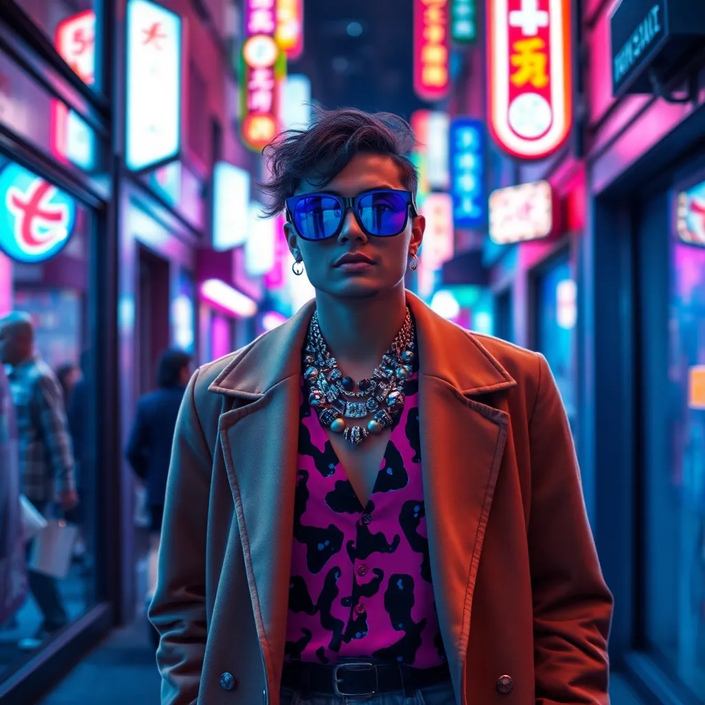 Capture the vibrant energy of a bustling city street by generating an AI image of a stylish individual walking down a neon-lit alleyway. Incorporate bold, bright colors and eclectic fashion elements, such as oversized sunglasses, chunky jewelry, and a statement coat, to create a truly eye-catching street style look.