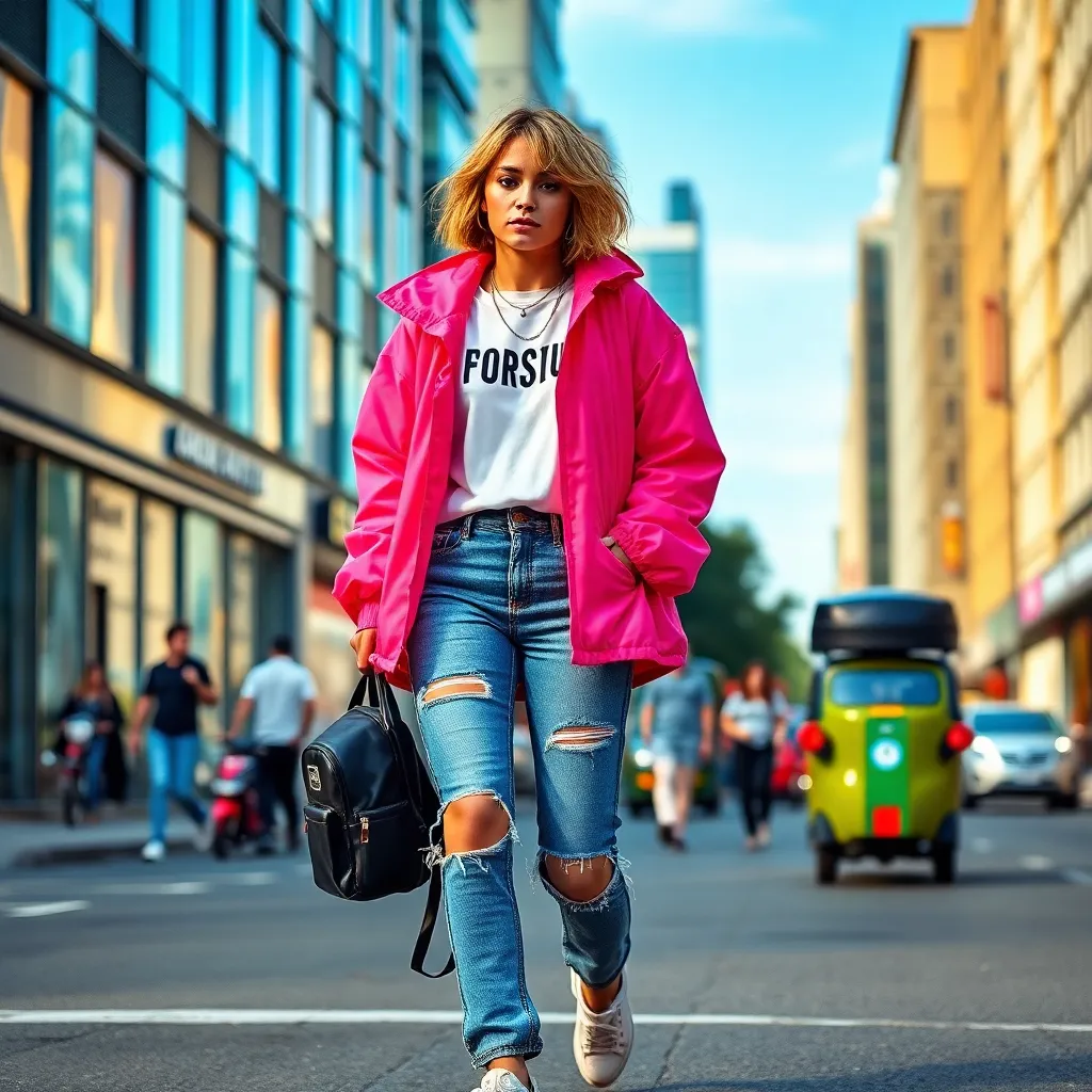 Create a vibrant street style image of a trendy young woman walking down a bustling city street. She's wearing a bold, neon-pink windbreaker over a white graphic t-shirt, high-waisted distressed denim jeans, and statement silver sneakers. Her hair is styled in a messy bob, and she's holding a retro-futuristic backpack.