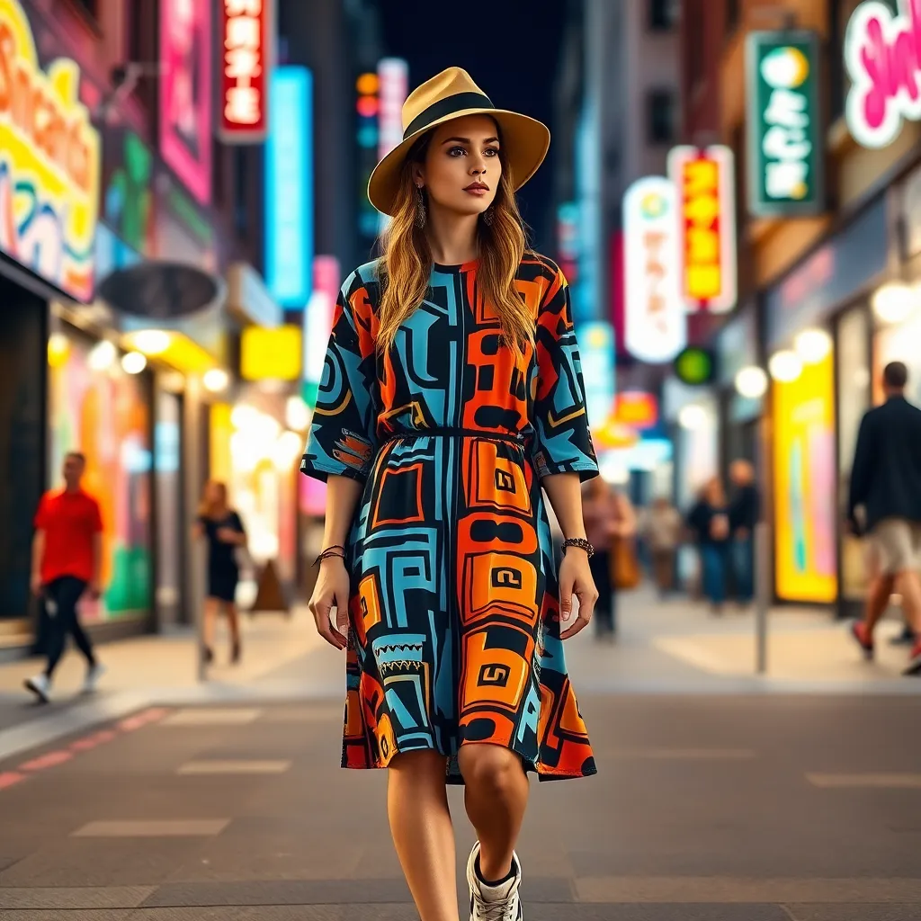 Capture the vibrant energy of Tokyo's Harajuku district with a street style image. Imagine a trendy young woman wearing a bold, colorful outfit featuring graphic patterns, statement accessories, and a statement handbag. The background is a bustling street lined with neon lights, street food stalls, and eclectic shops.