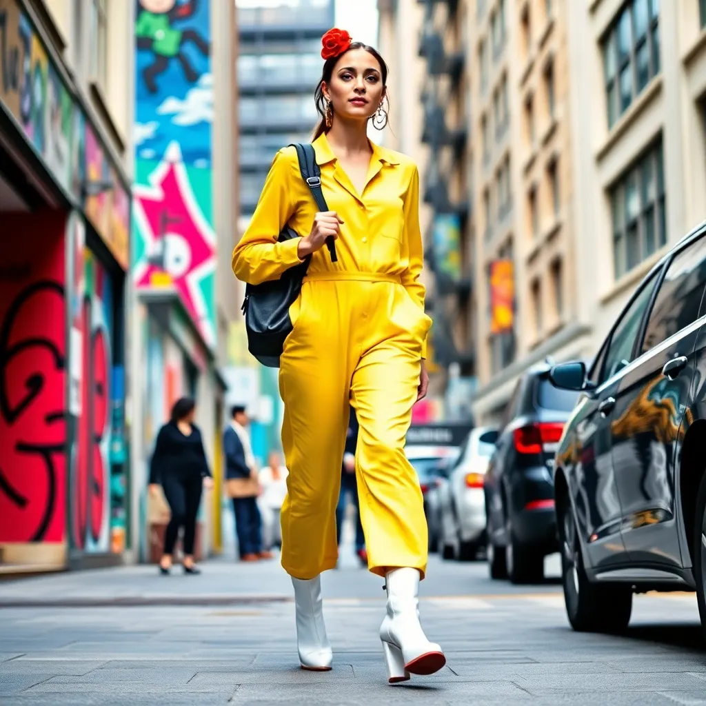 Capture the essence of a trendy urbanite on a sunny Saturday afternoon. Imagine a 25-year-old fashion enthusiast, clad in a bold yellow jumpsuit with white sneakers, oversized sunglasses, and a vibrant orange backpack, strolling down a bustling city street, surrounded by eclectic street art and vibrant graffiti.