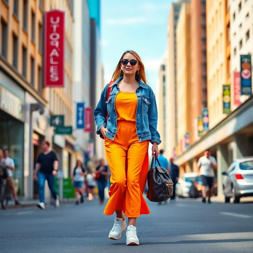 Create a vibrant street style image of a trendy young woman walking down a bustling city street on a sunny afternoon. She's wearing a bold, brightly colored jumpsuit with distressed denim jacket, paired with statement sunglasses, chunky sneakers, and a trendy backpack. Capture the dynamic energy of the cityscape.