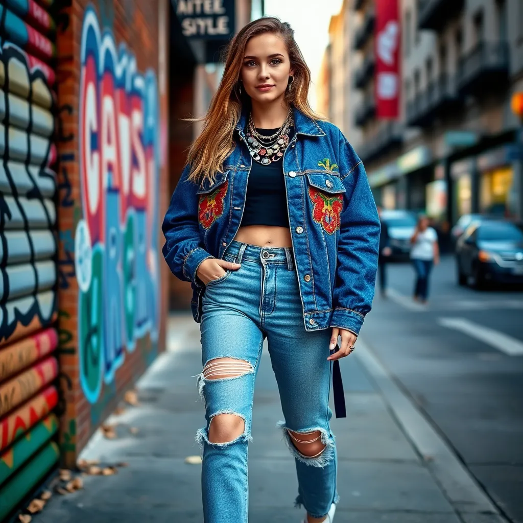 Create a vibrant street style image featuring a young woman in her 20s, wearing a bold, oversized denim jacket with colorful embroidery, paired with high-waisted, distressed denim jeans, white sneakers, and a statement-making, layered necklace. Set against a trendy, urban backdrop with graffiti-covered walls and a bustling city street.