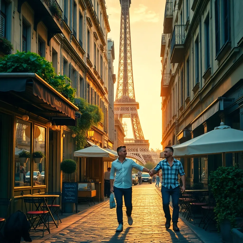 Capture the essence of a warm Parisian summer evening. Imagine a quaint cobblestone street lined with charming cafes and street performers. The Eiffel Tower stands tall in the distance, its iron latticework glowing softly under the golden hour sun. A relaxed couple strolls hand-in-hand, savoring the sweet scent of freshly baked croissants.