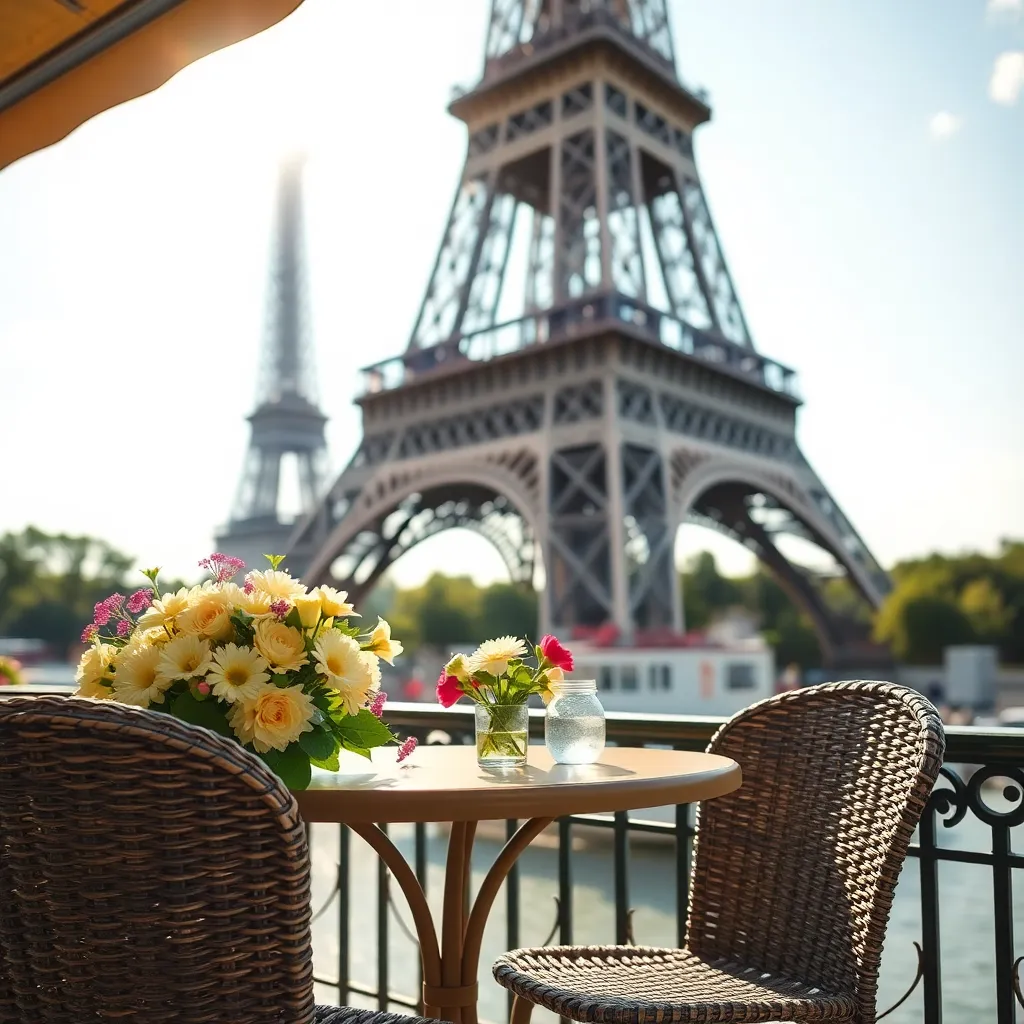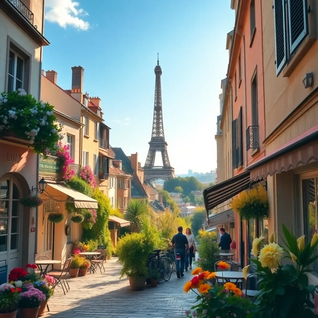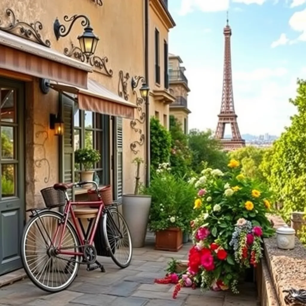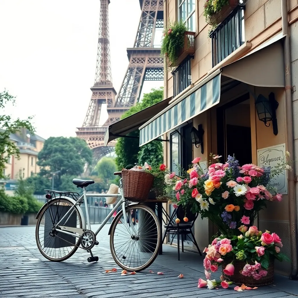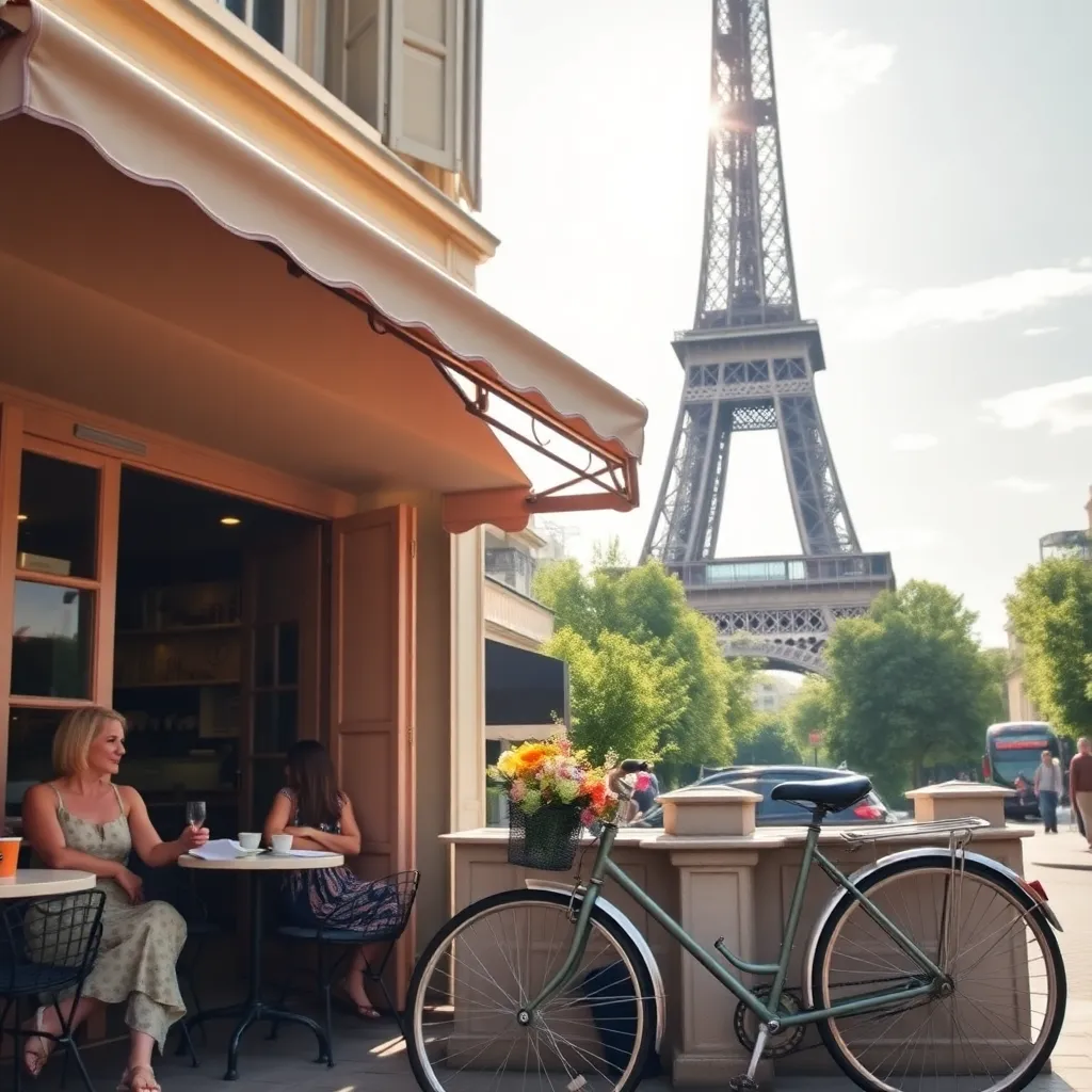Imagine a warm summer day in the City of Light, where the Eiffel Tower's iron latticework glistens in the sunlight. A charming café's awning is open, and a few patrons sit at small tables, sipping coffee and enjoying the gentle breeze. A vintage bicycle leans against the wall, adorned with a bouquet of fresh flowers.