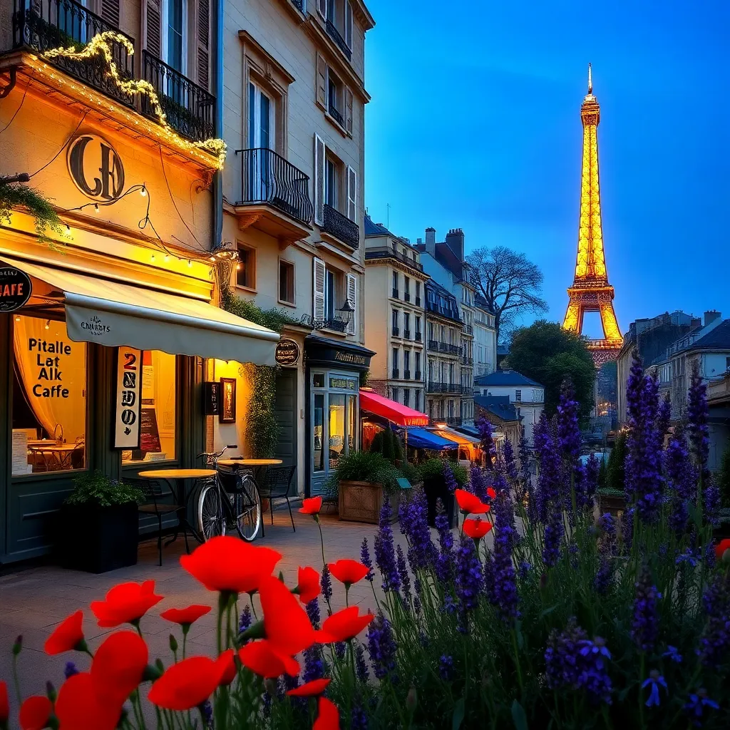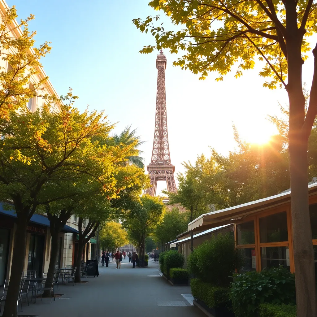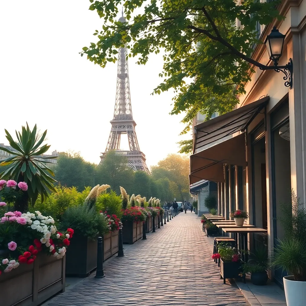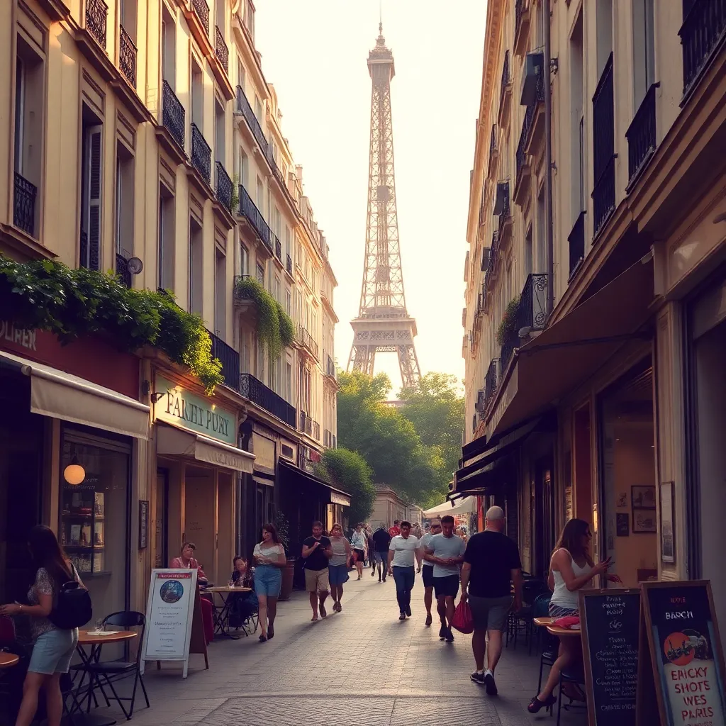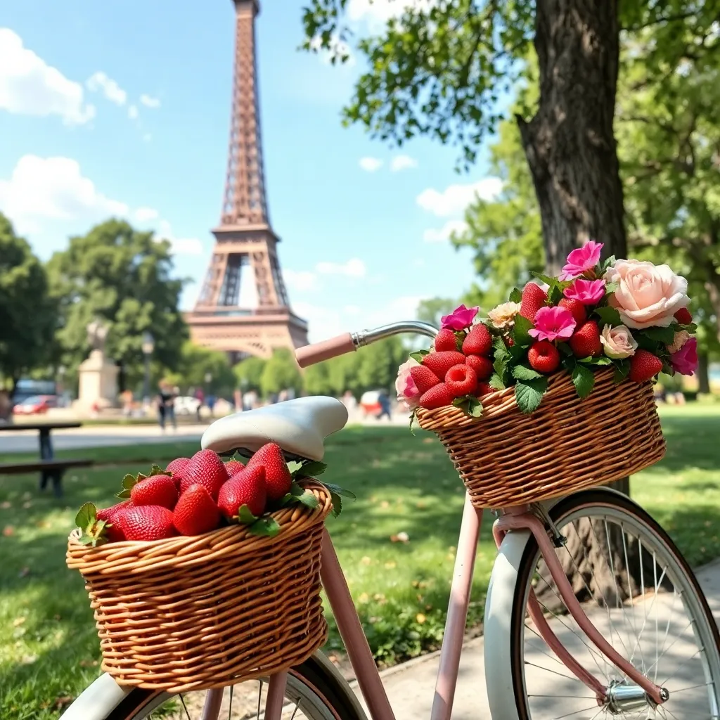 Imagine a warm summer day in the City of Light, where the Eiffel Tower's iron latticework glistens in the sunlight. A charming café's awning is open, and a few patrons sit at small tables, sipping coffee and enjoying the gentle breeze. A vintage bicycle leans against the wall, adorned with a bouquet of fresh flowers.