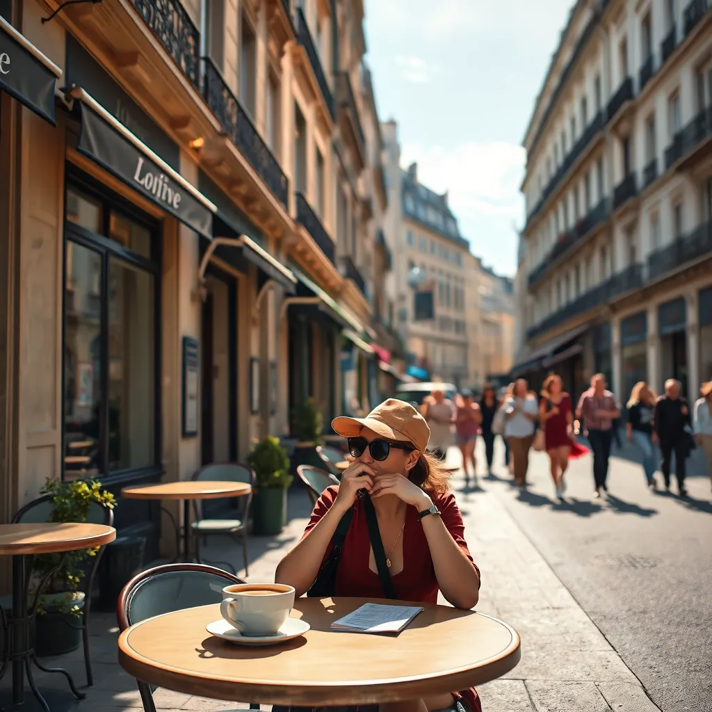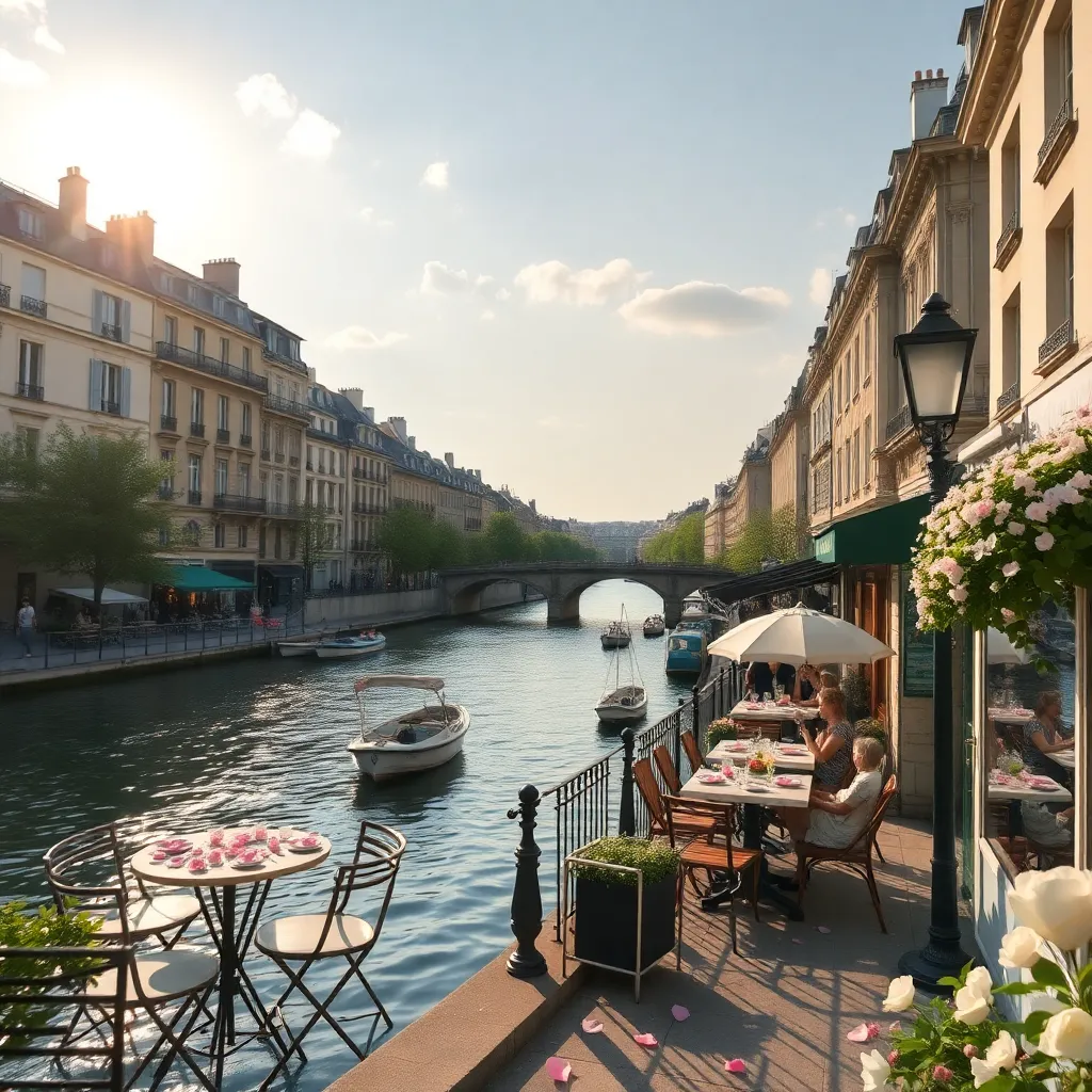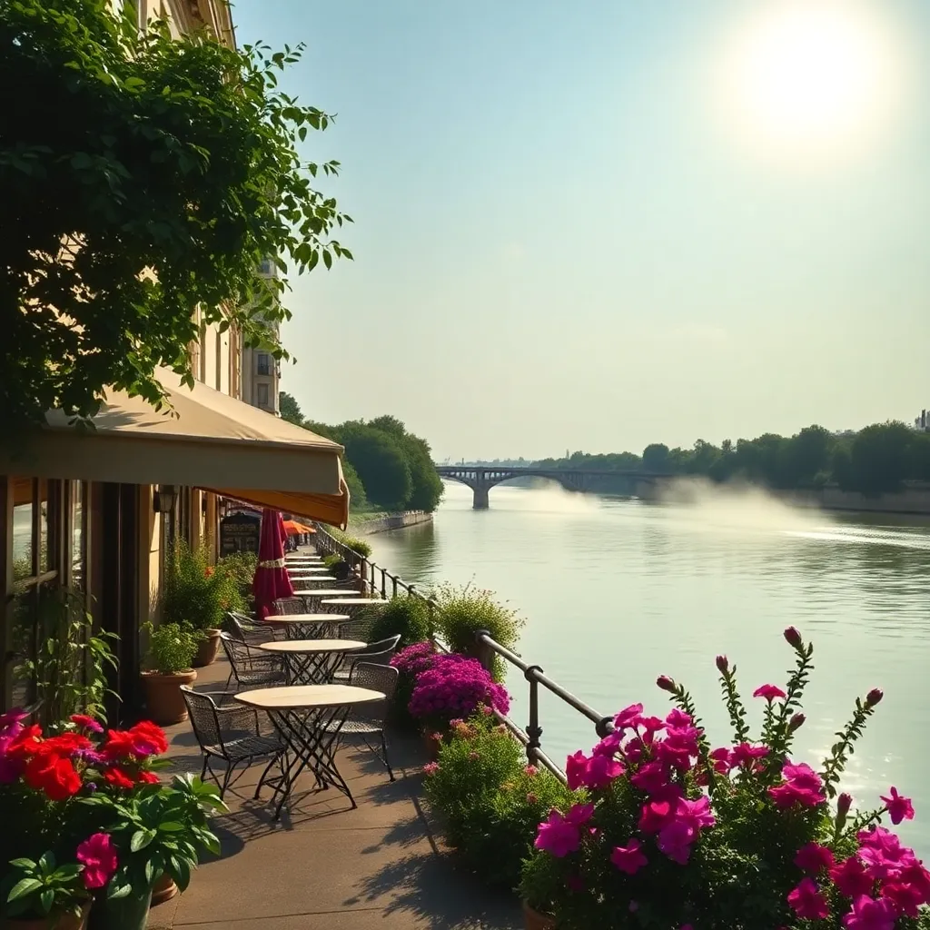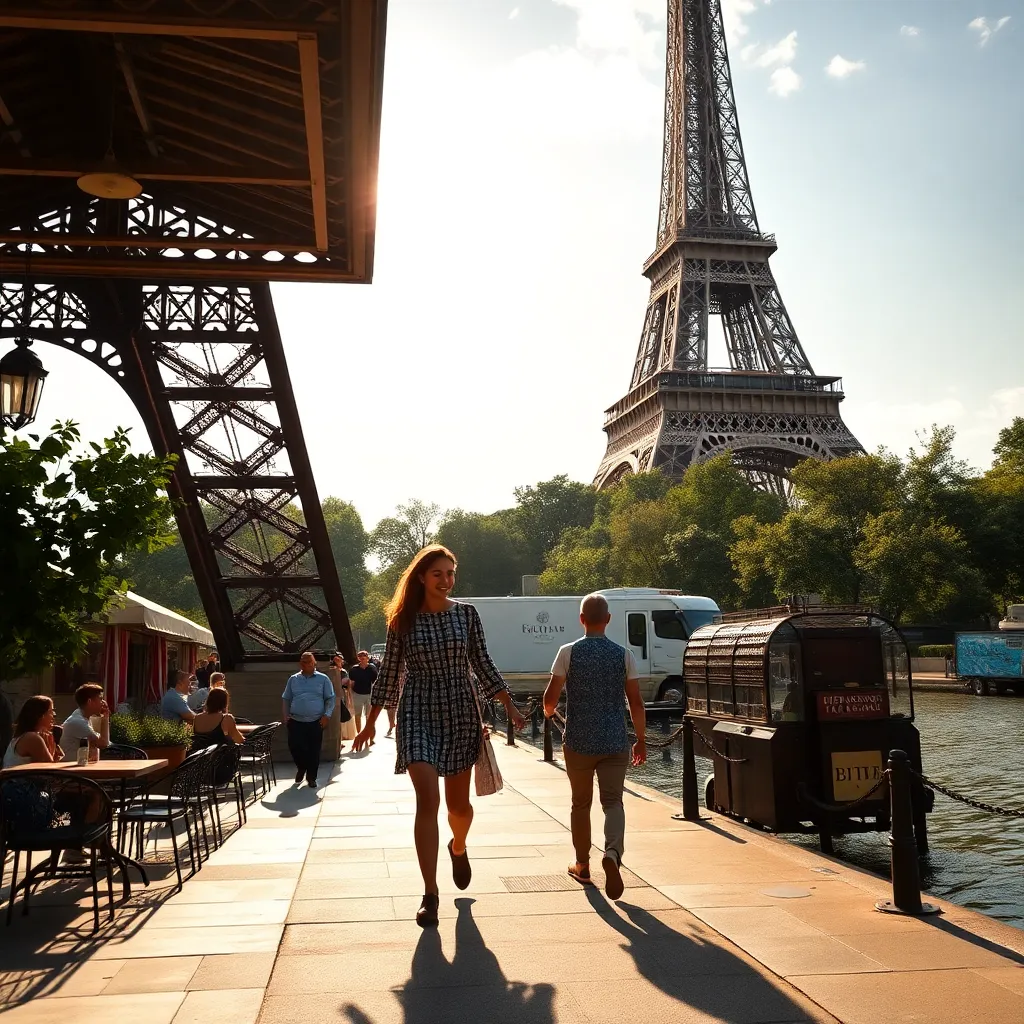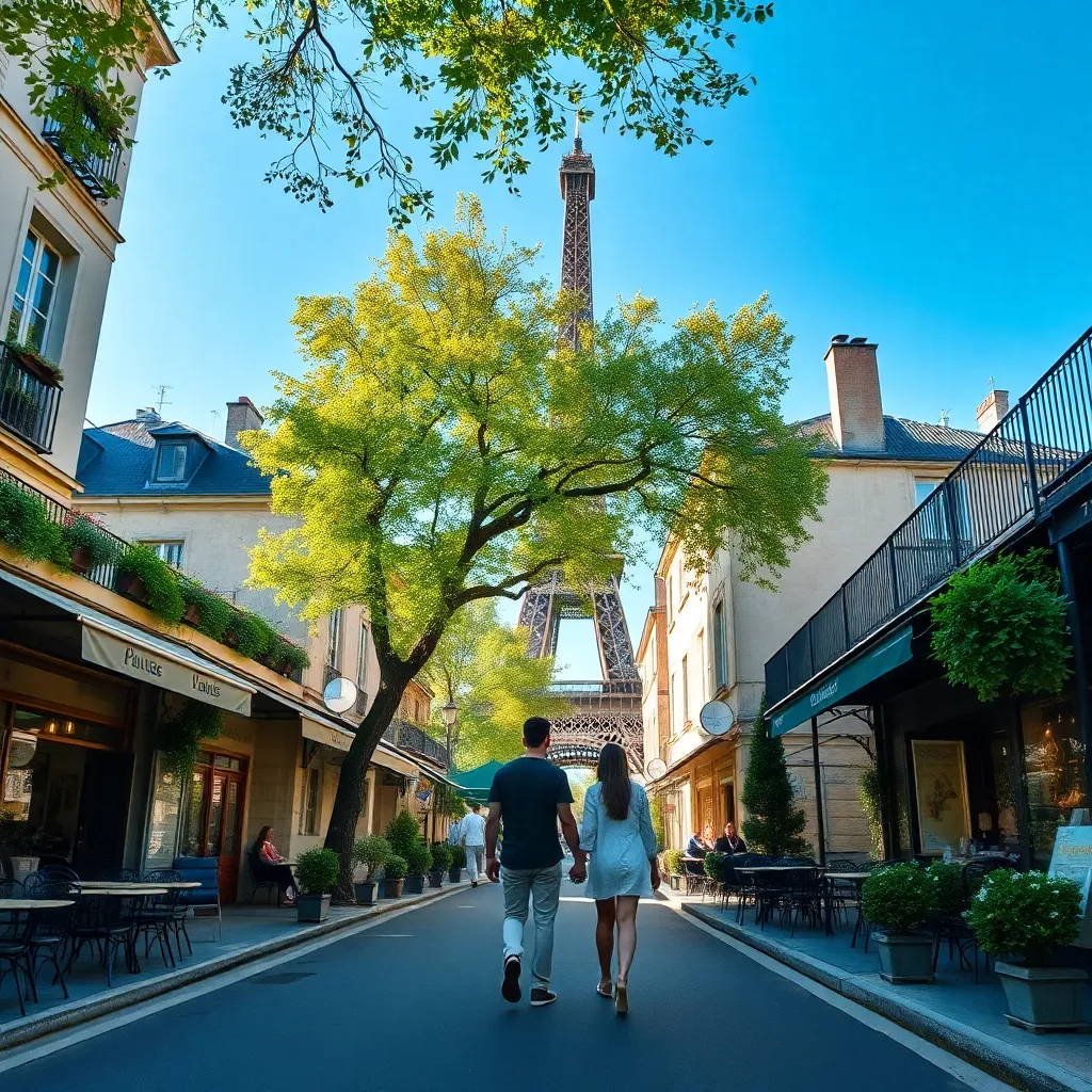 Imagine a warm summer day in the City of Light, where the Eiffel Tower's iron latticework glistens in the sunlight. A charming café's awning is open, and a few patrons sit at small tables, sipping coffee and enjoying the gentle breeze. A vintage bicycle leans against the wall, adorned with a bouquet of fresh flowers.