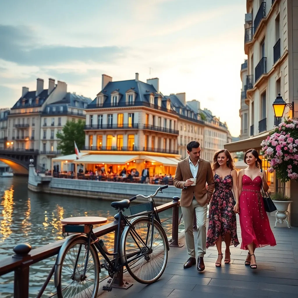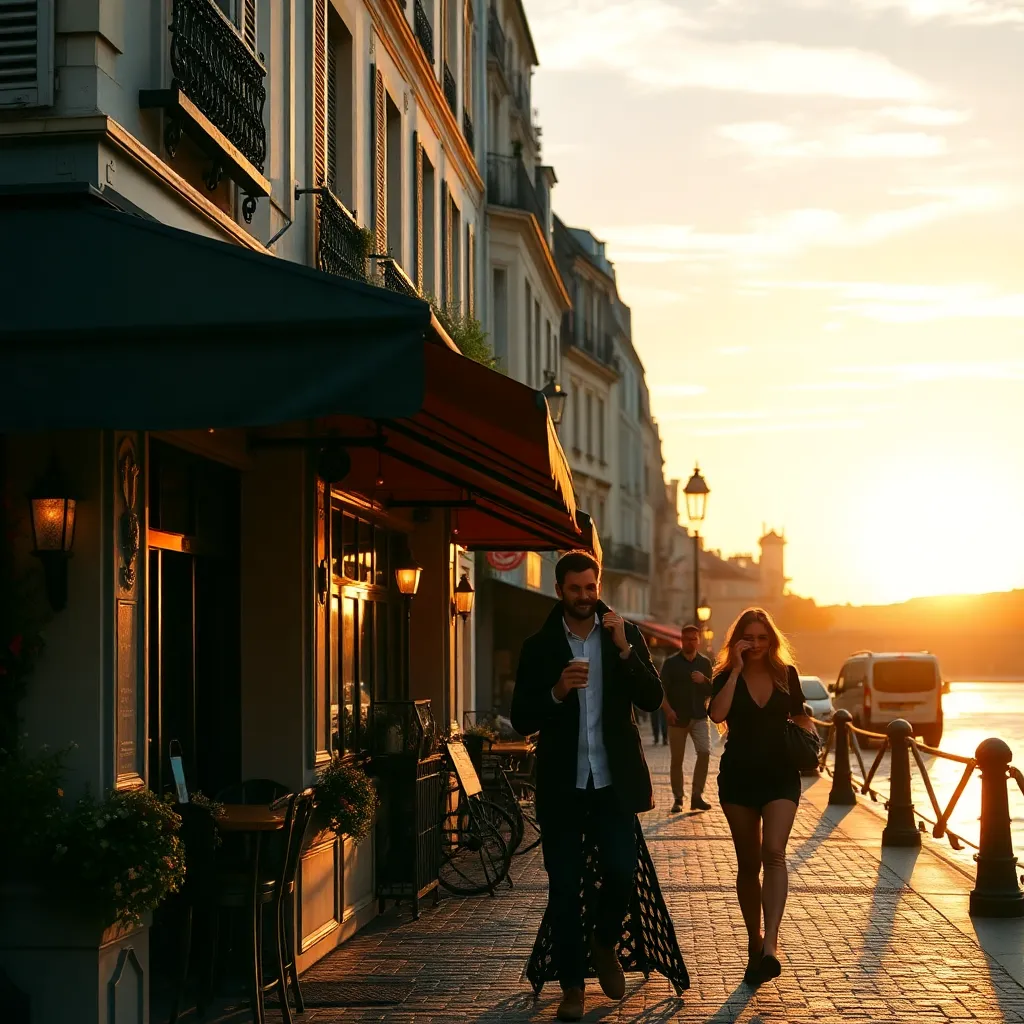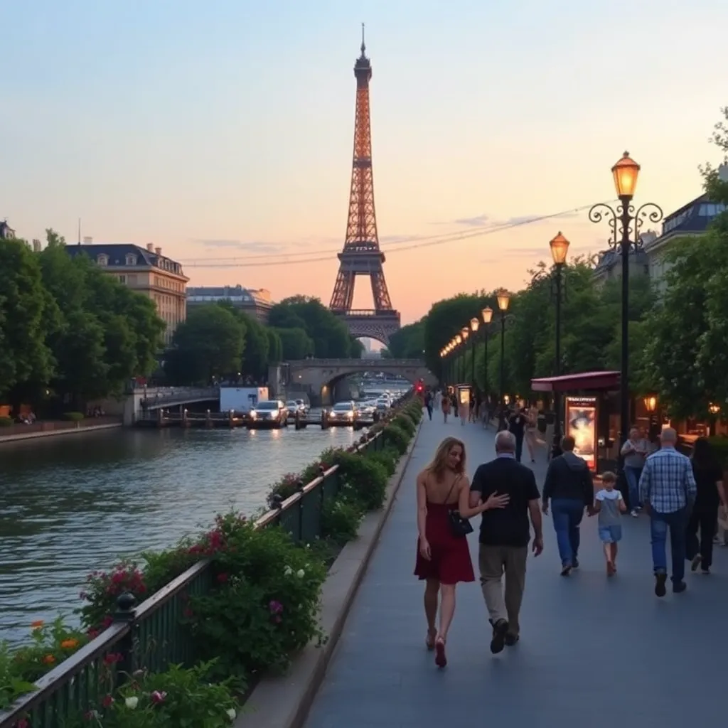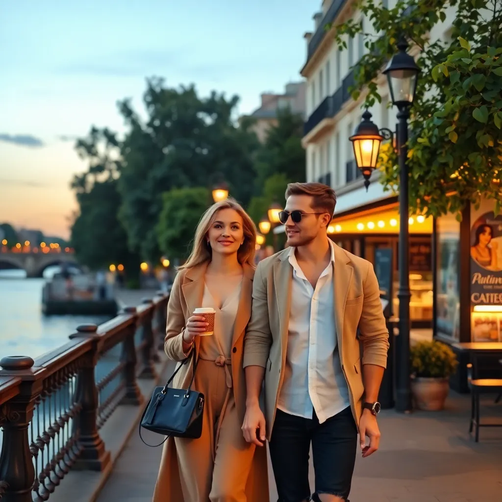 Capture the essence of a warm summer evening in the City of Light. Imagine a picturesque Seine Riverbank, adorned with twinkling street lamps and lush greenery. A stylish couple strolls hand-in-hand, sipping coffee and enjoying the sweet scent of freshly baked croissants wafting from a nearby patisserie.