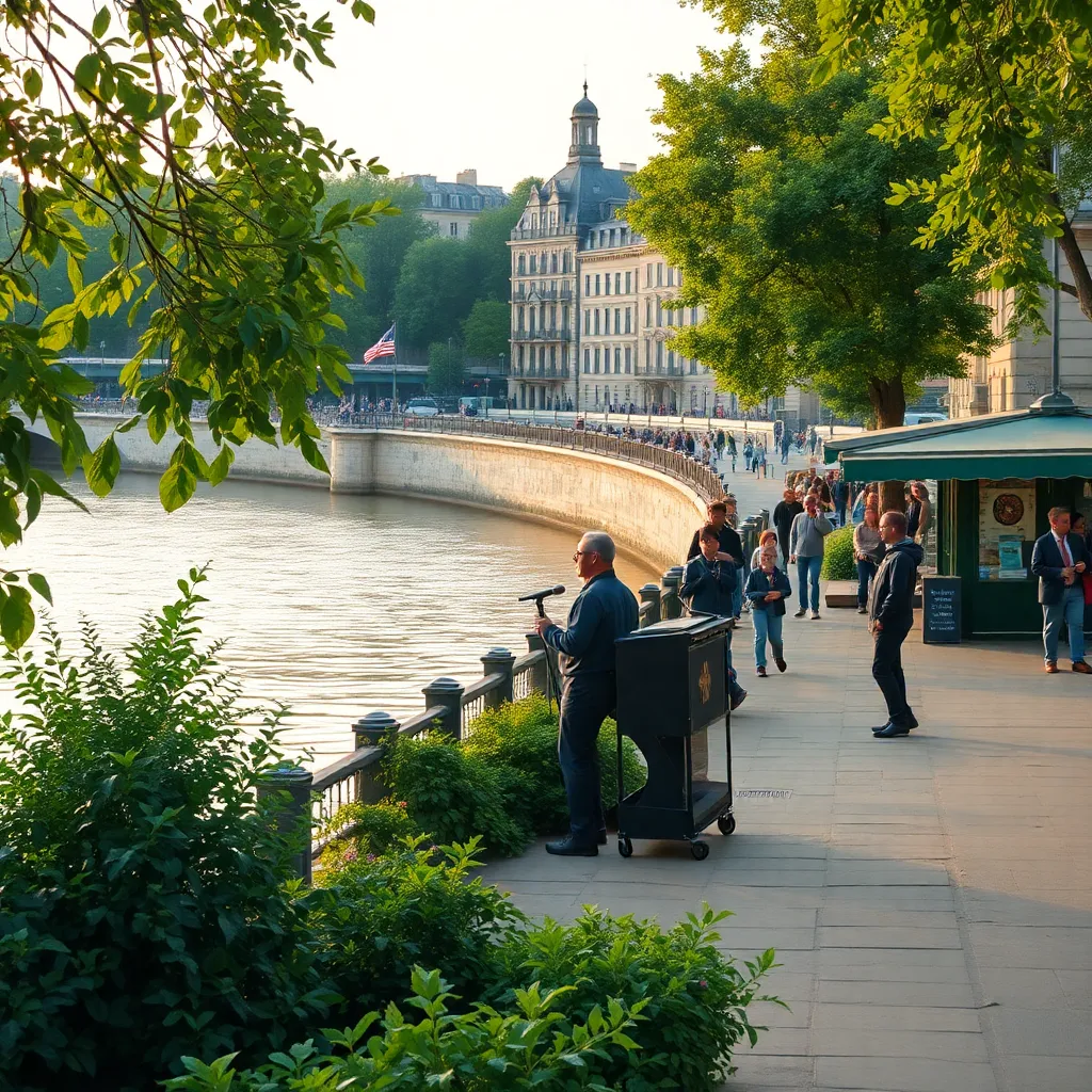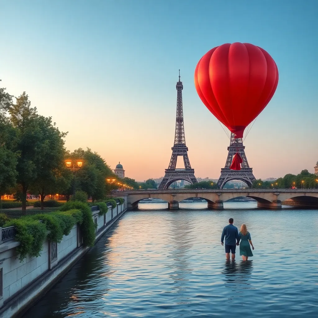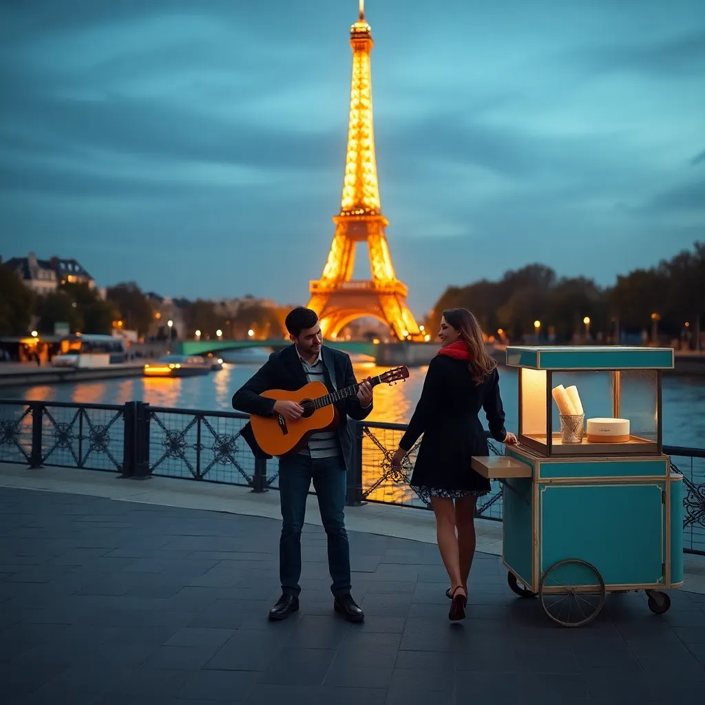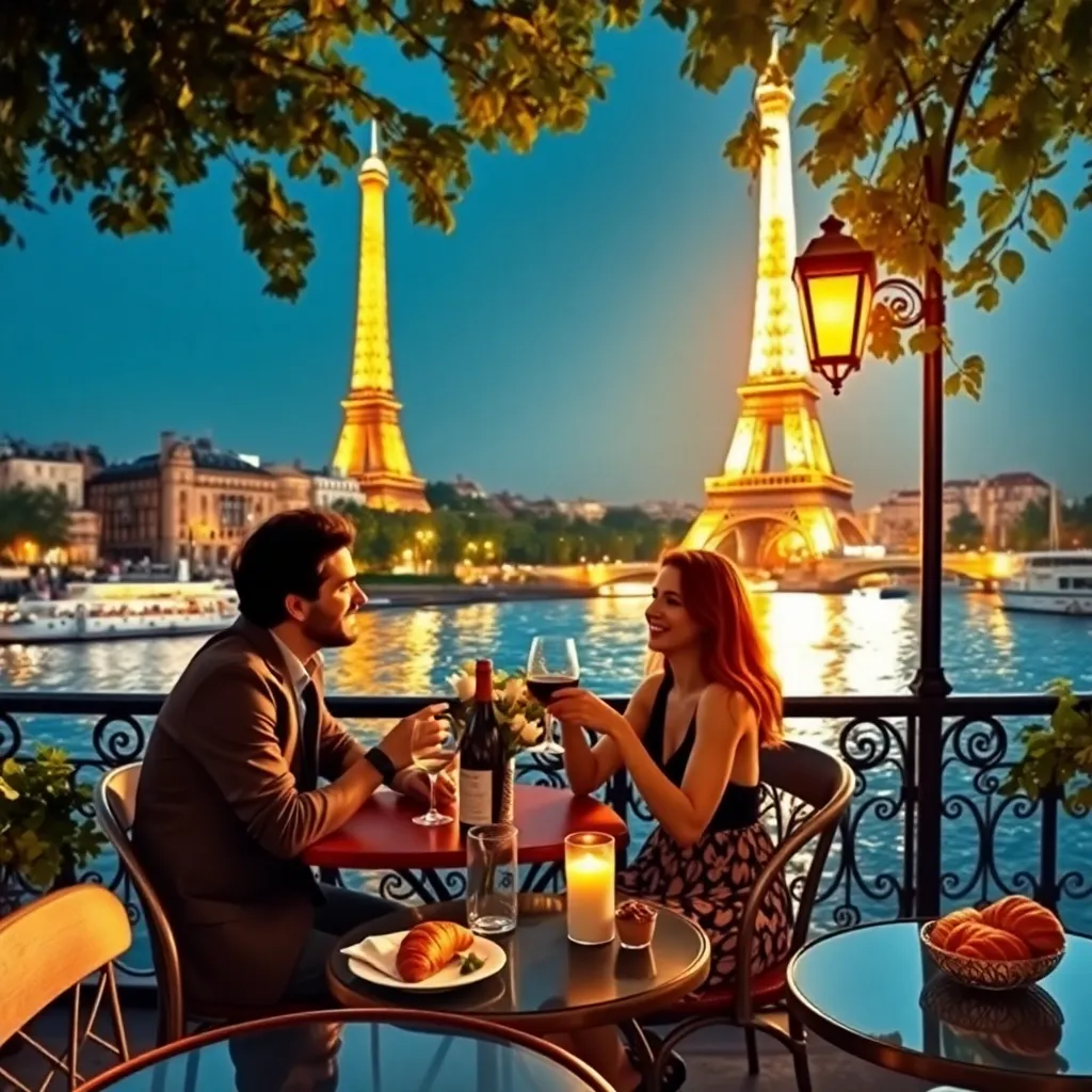 Capture the essence of a warm summer evening in the City of Light. Imagine a picturesque Seine Riverbank, adorned with twinkling street lamps and lush greenery. A stylish couple strolls hand-in-hand, sipping coffee and enjoying the sweet scent of freshly baked croissants wafting from a nearby patisserie.