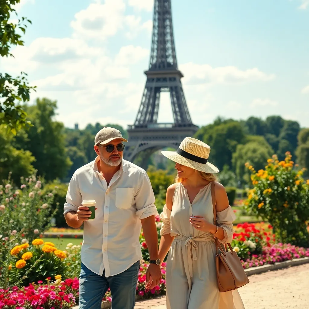 Capture the essence of a sun-kissed summer in the City of Light. Imagine a warm afternoon in the Luxembourg Gardens, where the Eiffel Tower stands tall amidst lush greenery and vibrant flowers. A stylish couple, dressed in linen and straw hats, strolls hand-in-hand, sipping coffee and soaking up the joie de vivre.