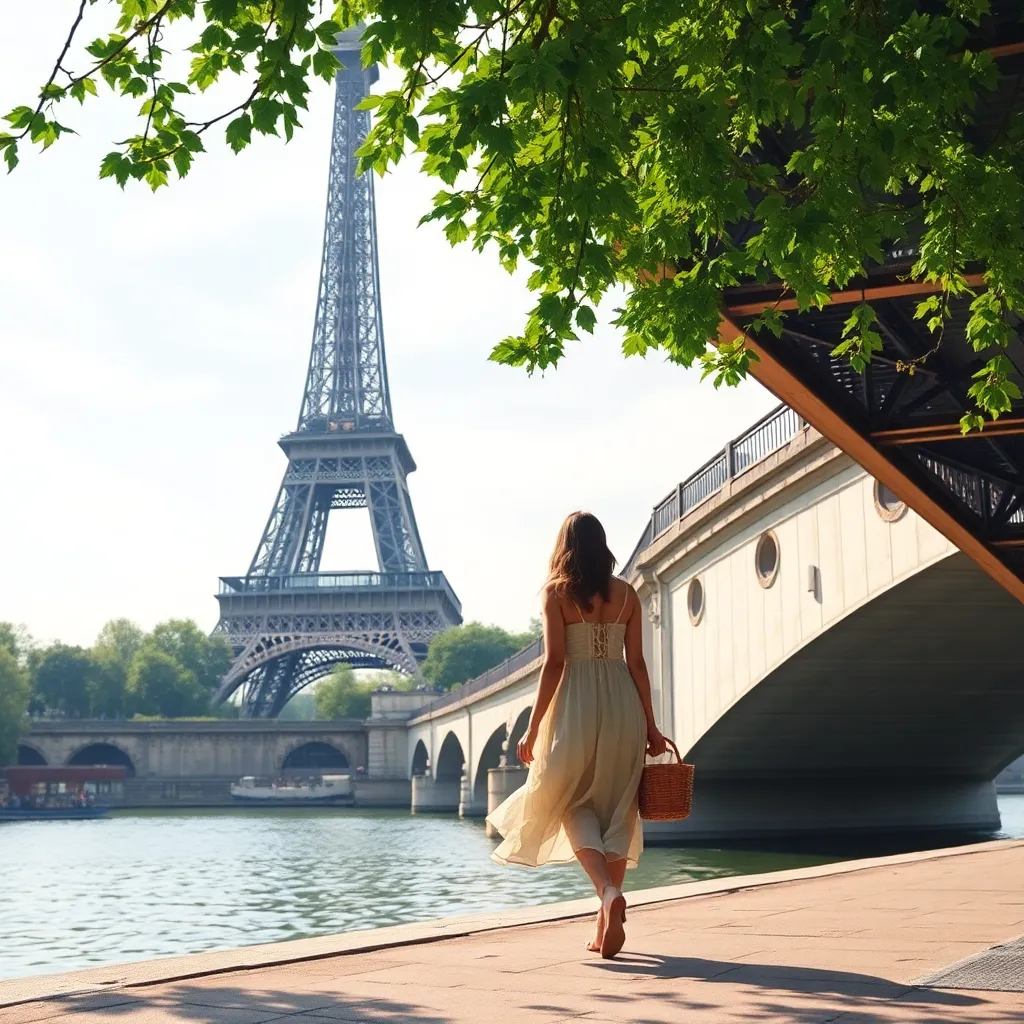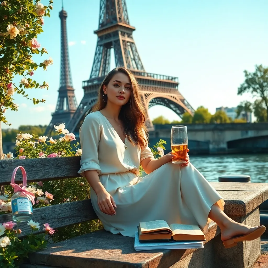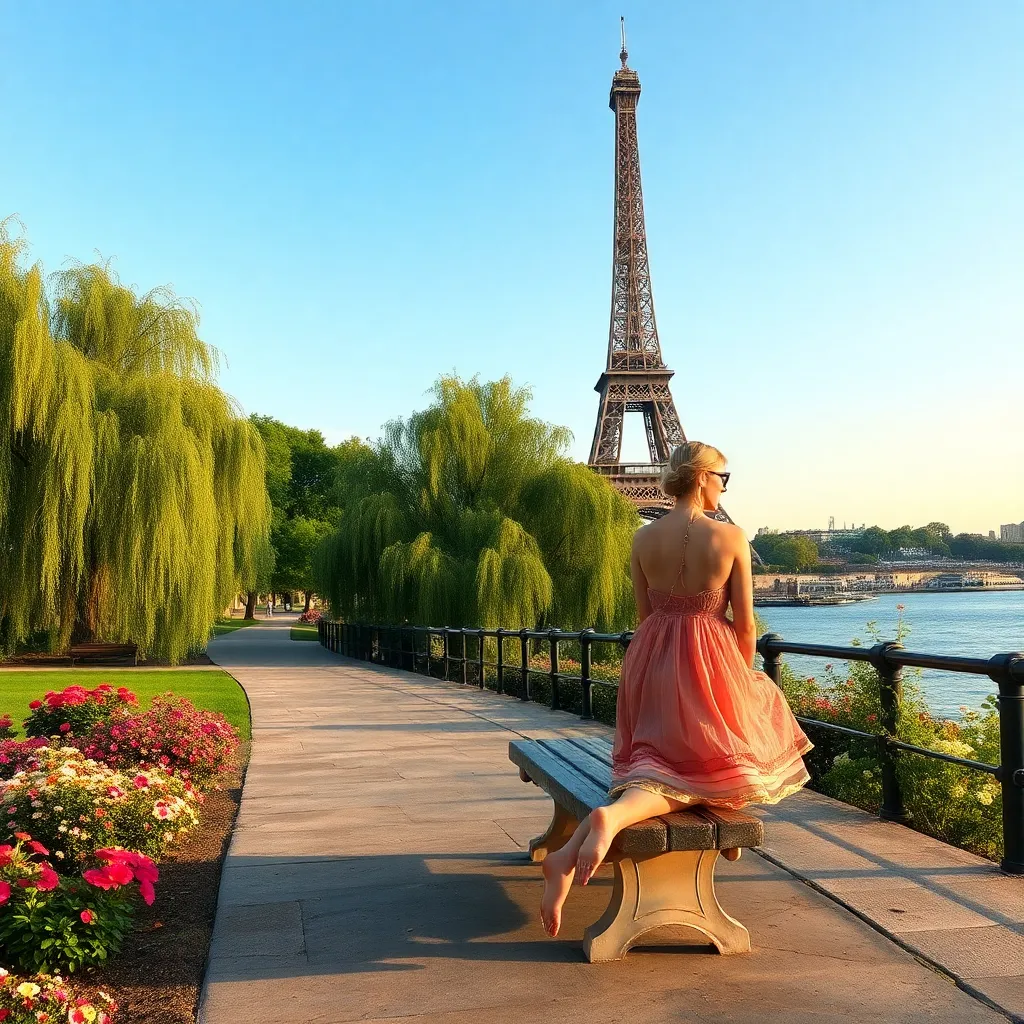 Capture the essence of a warm summer day in the City of Light. Imagine a tranquil Seine River bank, lined with ancient willow trees and vibrant flowers. A solitary figure, dressed in a flowing sundress, sits on a weathered stone bench, lost in thought as the Eiffel Tower rises majestically in the background.