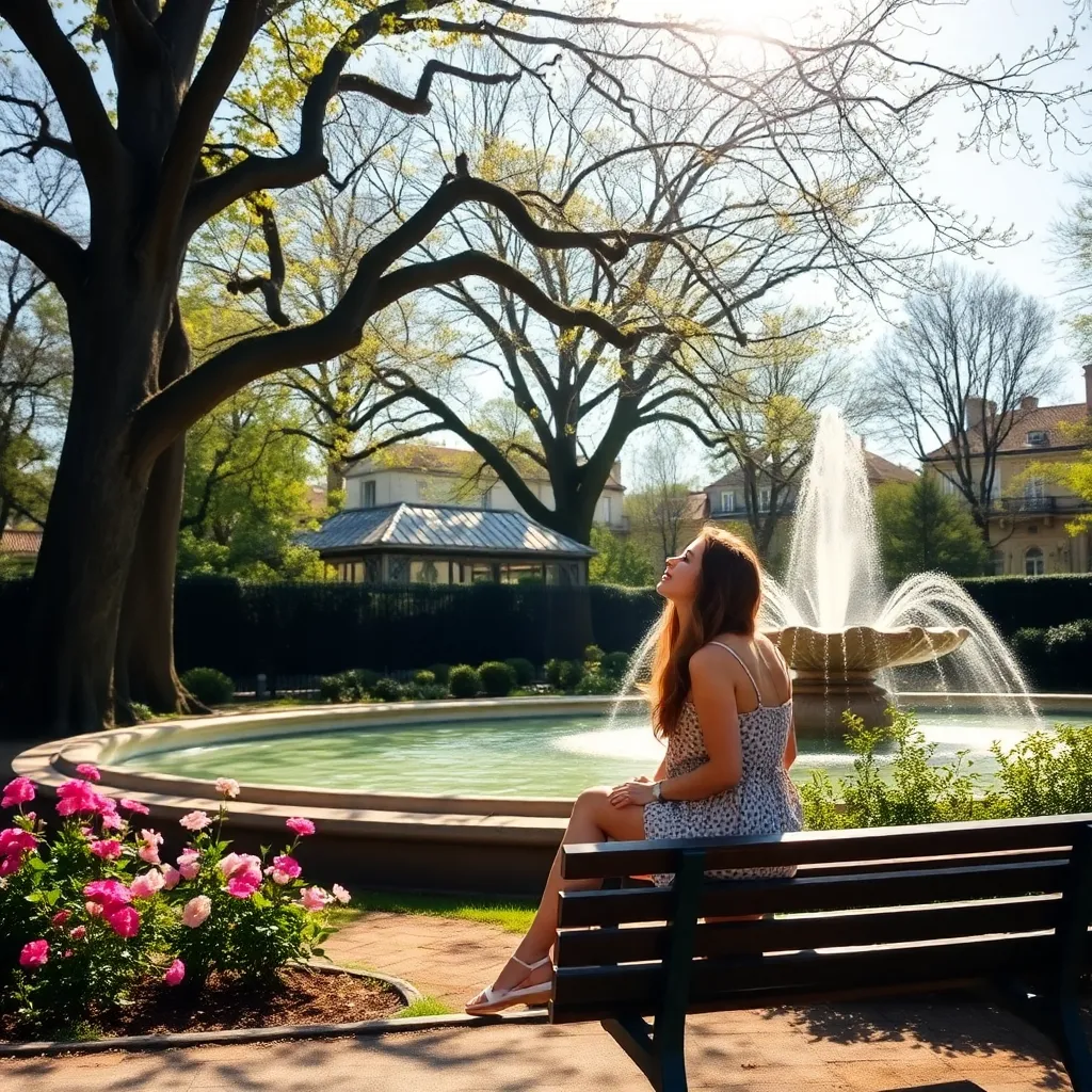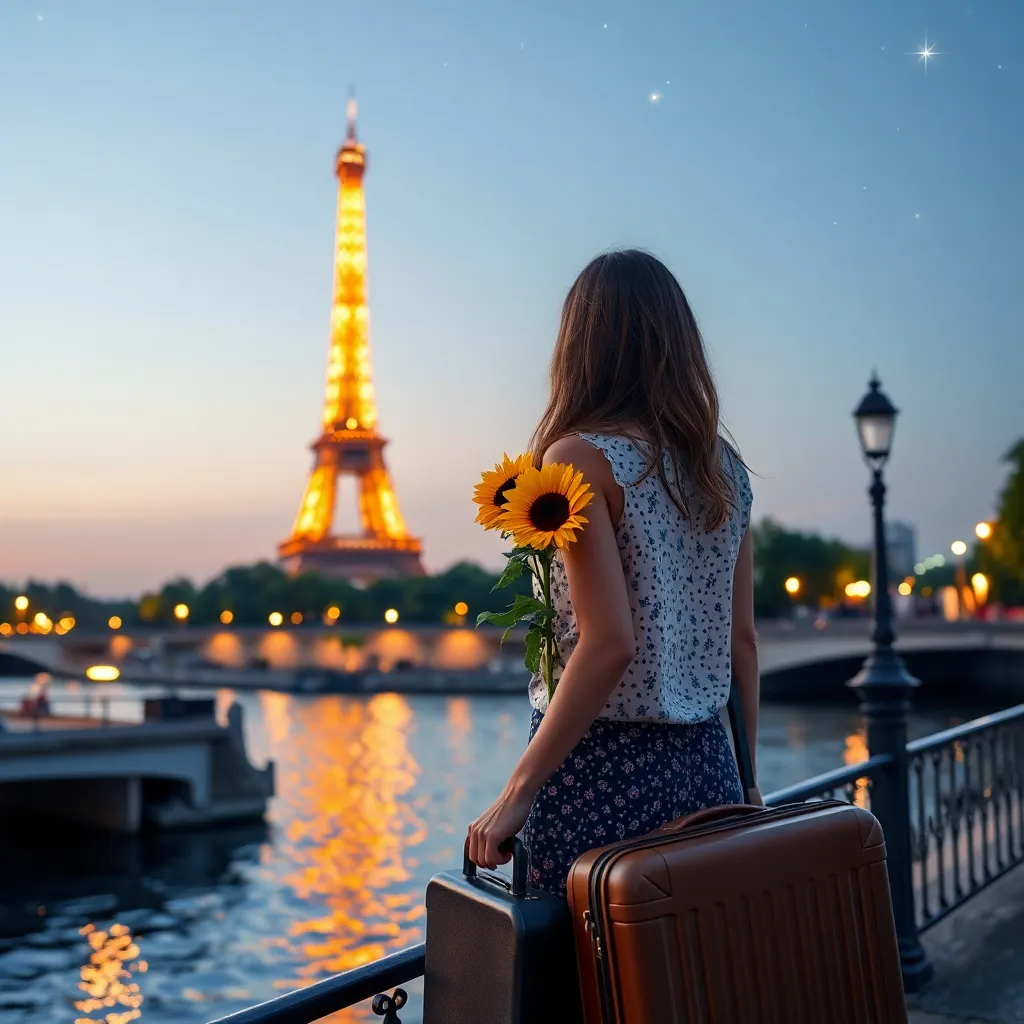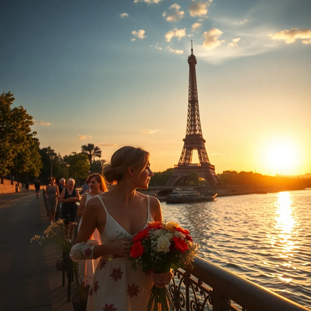 Capture the essence of a warm summer day in the City of Light. Imagine a tranquil Seine River bank, lined with ancient willow trees and vibrant flowers. A solitary figure, dressed in a flowing sundress, sits on a weathered stone bench, lost in thought as the Eiffel Tower rises majestically in the background.