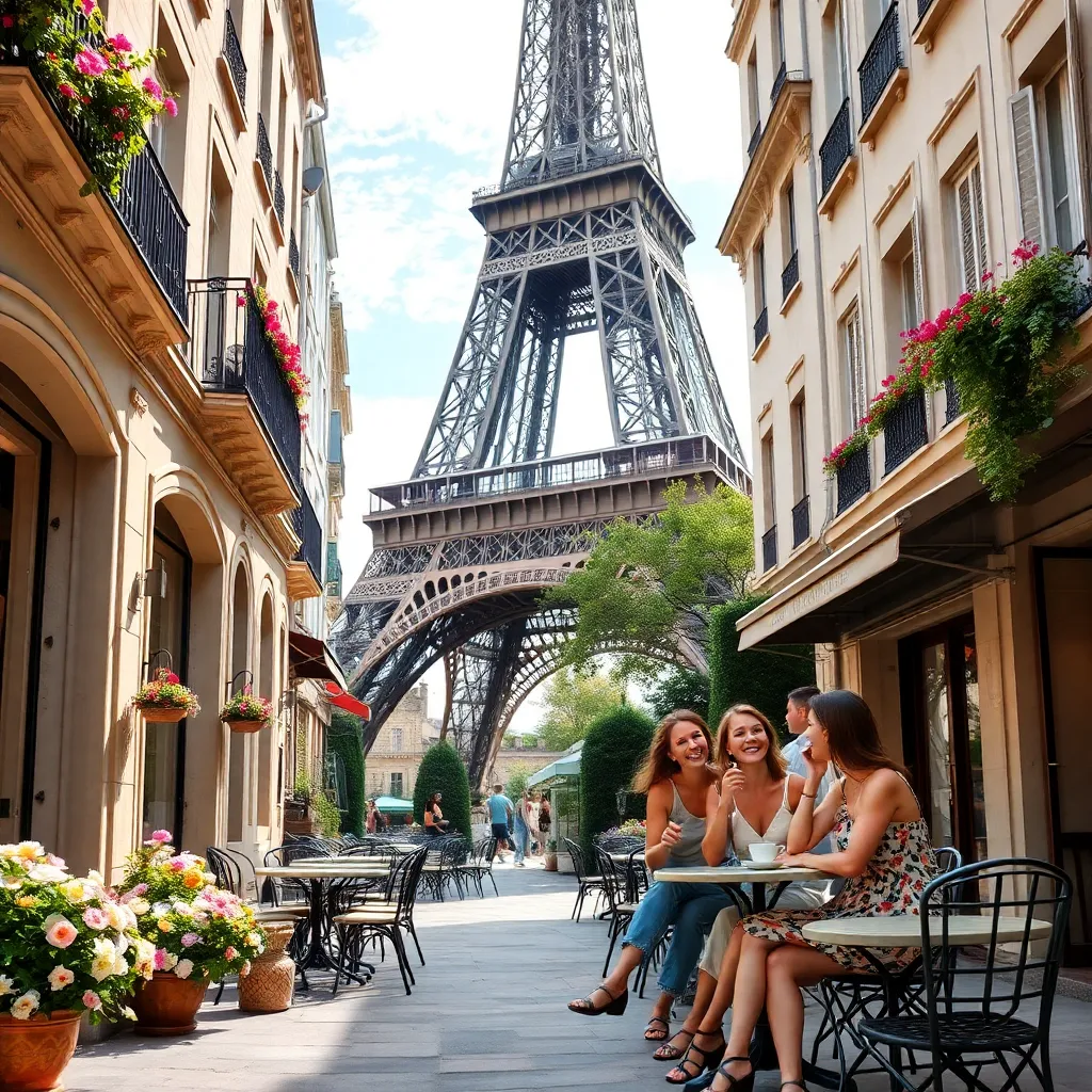 Capture the essence of a sun-kissed summer in the City of Love. Imagine a warm afternoon in a charming Parisian street, lined with historic buildings, blooming flowers, and quaint cafes. A gentle breeze stirs the Eiffel Tower's iron latticework as a group of friends laugh and sip coffee beneath its shadow.