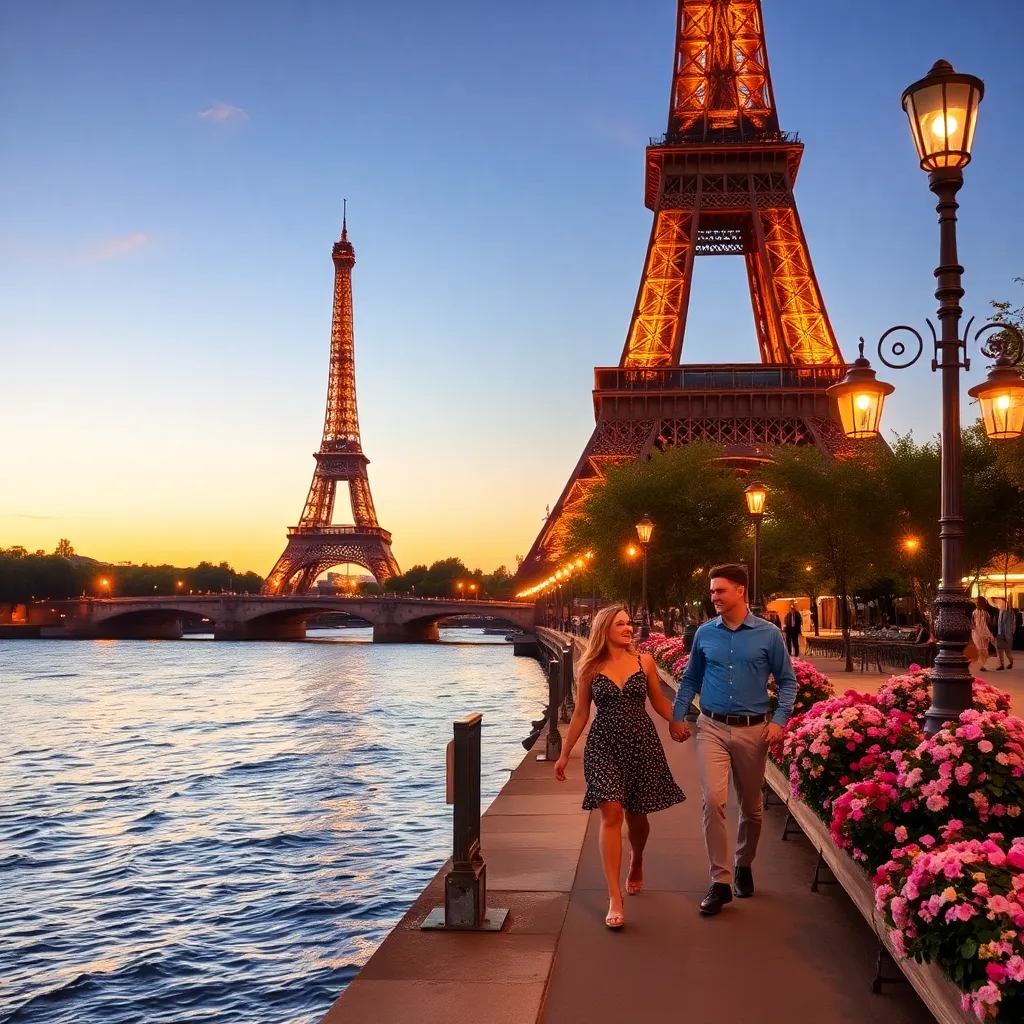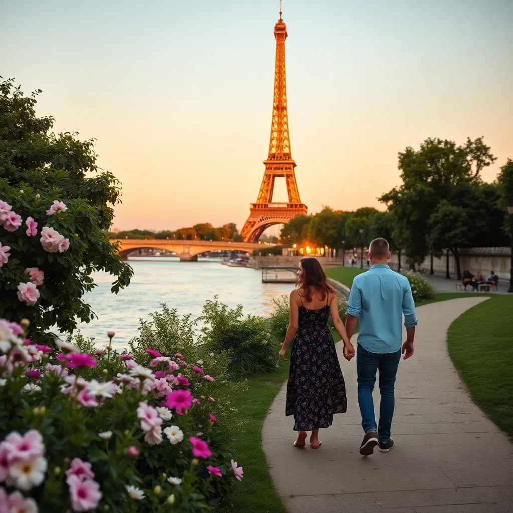 Capture the essence of a warm summer evening in the City of Light. Imagine a serene Seine Riverbank, with the Eiffel Tower's golden glow reflecting off the water. A young couple strolls hand-in-hand, surrounded by blooming flowers and lush greenery, as the sounds of jazz music drift through the air.