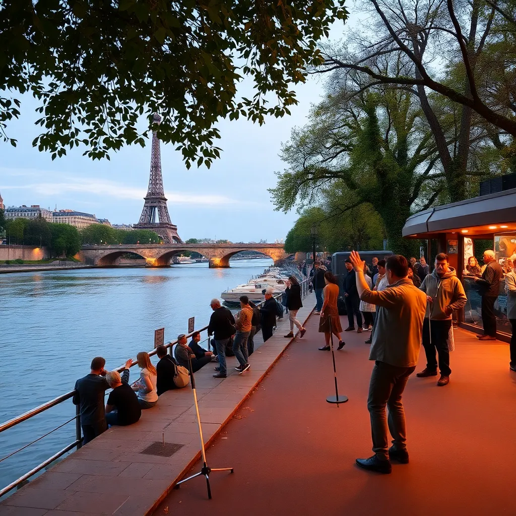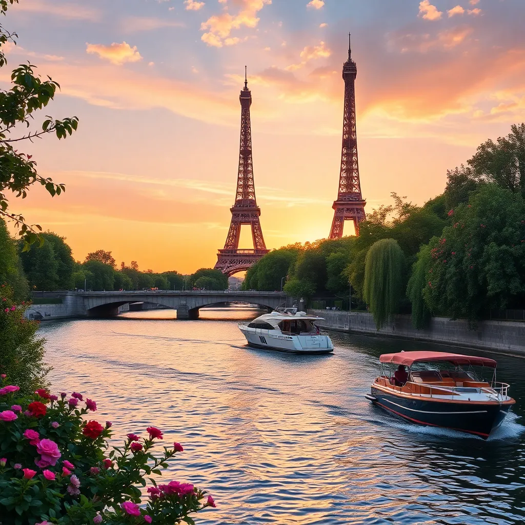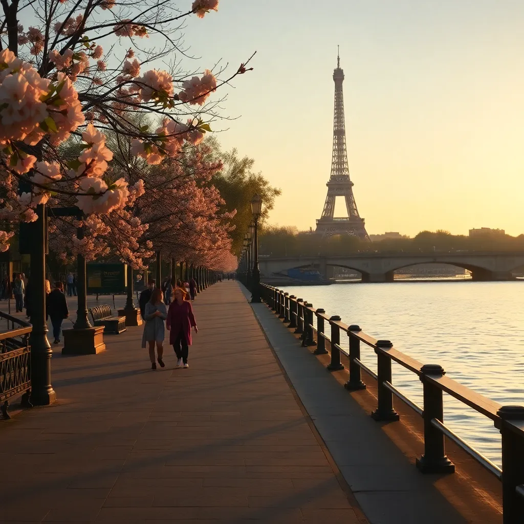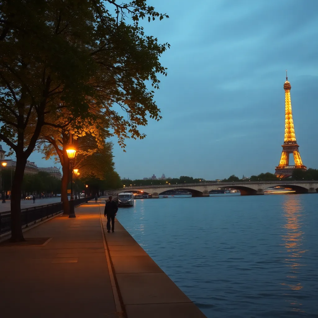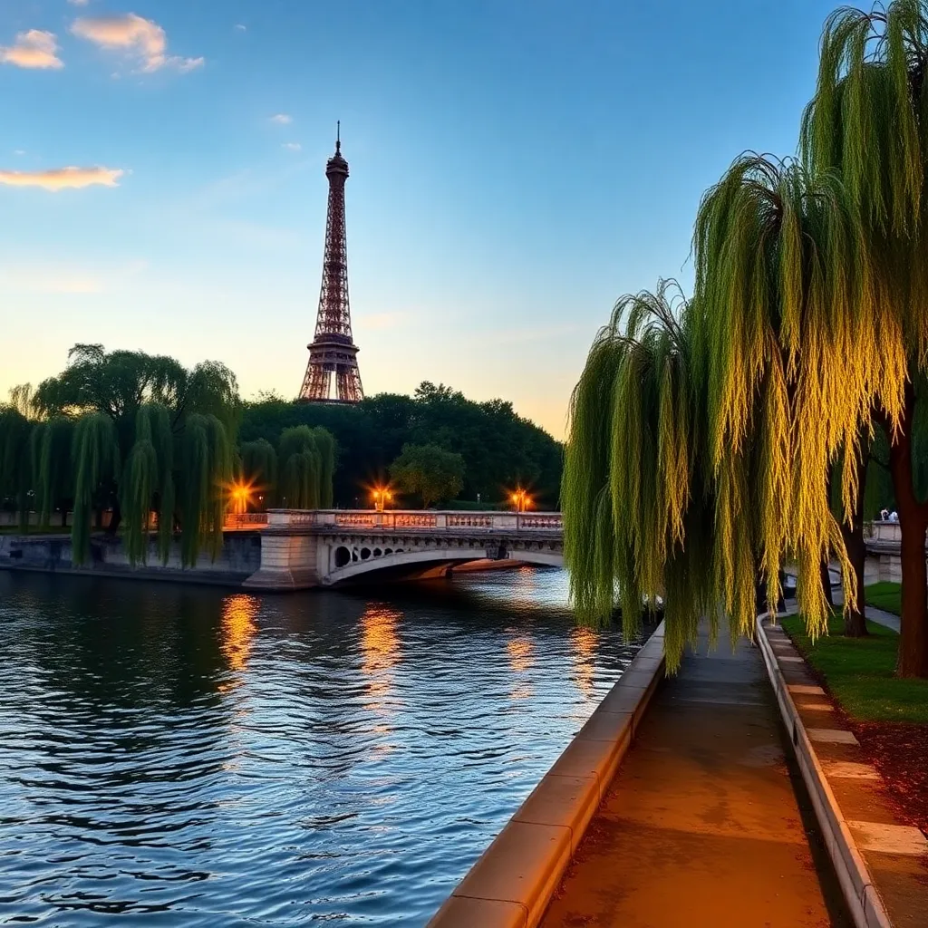 Capture the essence of a warm summer evening in the City of Light. Imagine a serene Seine Riverbank, lined with ancient willow trees, as the Eiffel Tower's iron latticework glows softly in the golden hour. A gentle breeze carries the sweet scent of freshly baked croissants and the soft hum of jazz music.