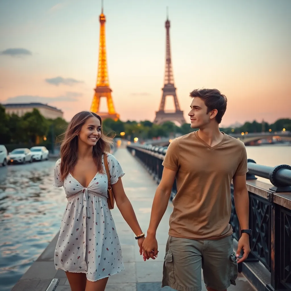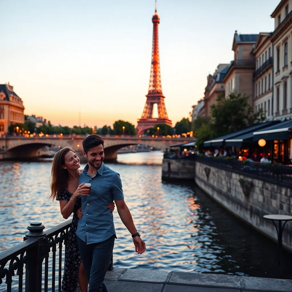 Capture the essence of a warm summer evening in the City of Light. Imagine a lazy Seine River, adorned with twinkling lights, surrounded by ancient bridges and charming cafes. A couple strolls hand-in-hand, sipping coffee and laughing together, as the Eiffel Tower rises majestically in the background.