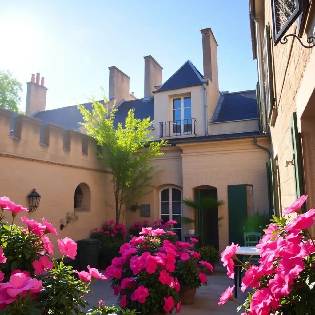 Capture the essence of a sun-kissed summer in the City of Light. Imagine a warm afternoon in a charming Parisian courtyard, surrounded by blooming flowers, ancient stone walls, and the soft glow of sunlight filtering through the trees. Incorporate vibrant colors, soft textures, and a sense of joie de vivre.