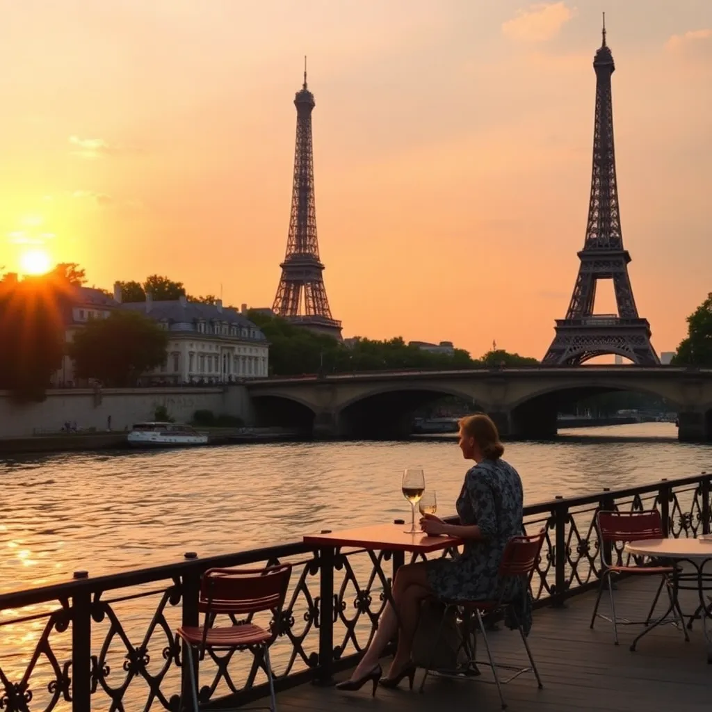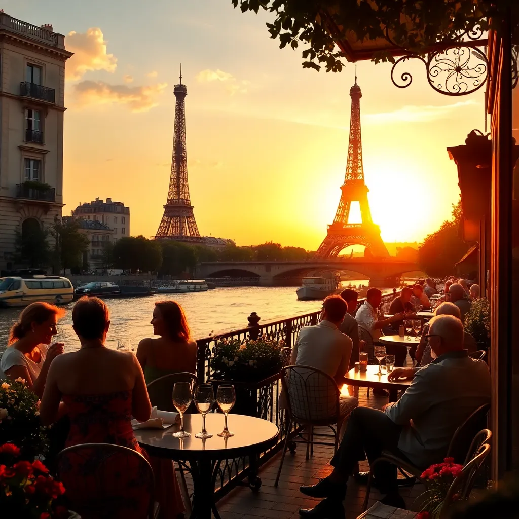 Capture the essence of a romantic summer evening in the City of Light. Imagine a warm sunset casting a golden glow on the Seine River, with a charming café patio filled with laughing couples and the Eiffel Tower's iron latticework glistening in the distance. What secrets will this scene whisper to you?