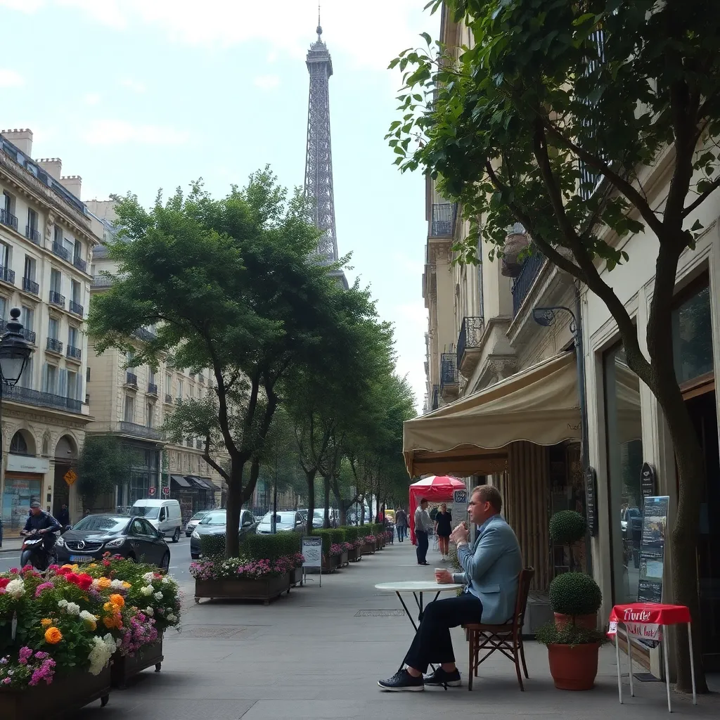 Capture the essence of a lazy summer afternoon in the City of Love. A picturesque Parisian street, lined with blooming flowers and ancient trees, stretches out before a lone figure sipping a café au lait at a charming sidewalk café. The Eiffel Tower rises gently in the background, shrouded in a warm haze.