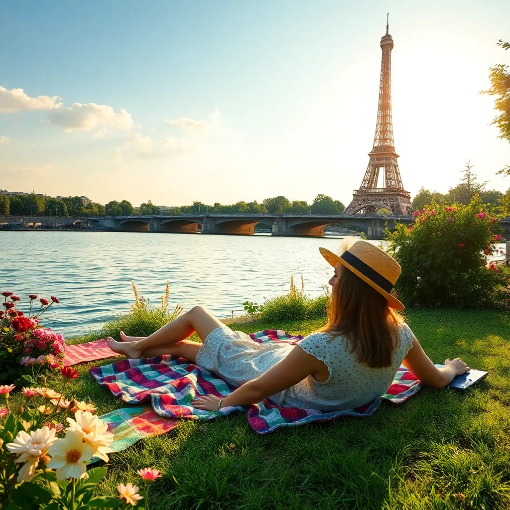 Capture the essence of a lazy summer afternoon in the City of Light. Imagine a serene Seine Riverbank, where a young couple lounges on a colorful picnic blanket, surrounded by blooming flowers and lush greenery. The Eiffel Tower rises majestically in the background, as the warm sun casts a golden glow.