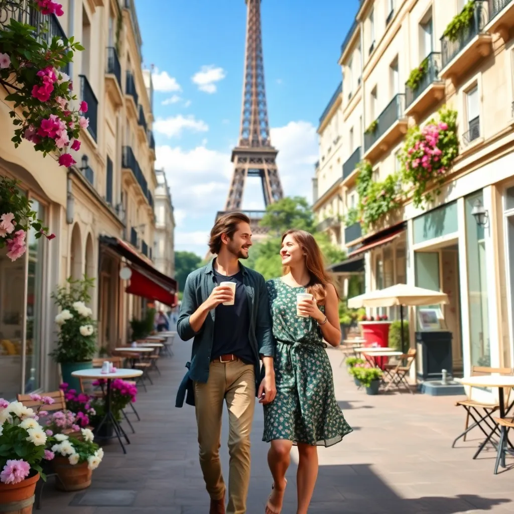 Capture the essence of a sun-kissed summer day in the City of Love. Imagine a charming Parisian street lined with blooming flowers, quaint cafes, and historic landmarks. A young couple strolls hand-in-hand, sipping coffee and laughing as the Eiffel Tower towers above. What's the perfect summer moment in Paris?