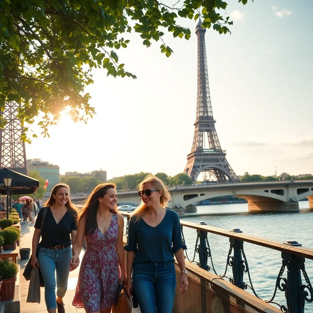 Capture the essence of a warm summer evening in the City of Love. Imagine a picturesque Seine Riverbank, with the Eiffel Tower's iron latticework glistening in the sunset. A group of friends, dressed in flowy summer attire, stroll hand-in-hand, laughing and chatting as they take in the romantic ambiance.