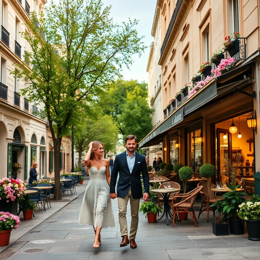 Capture the essence of a warm summer evening in the City of Light. Imagine a picturesque Parisian street, lined with blooming flowers and majestic trees, where a charming café spills out onto the sidewalk. A romantic couple, hand in hand, stroll by, savoring the sweet aroma of freshly baked croissants.