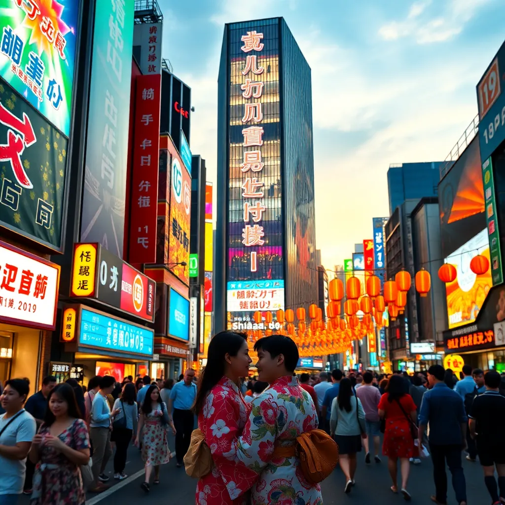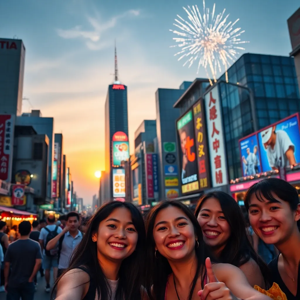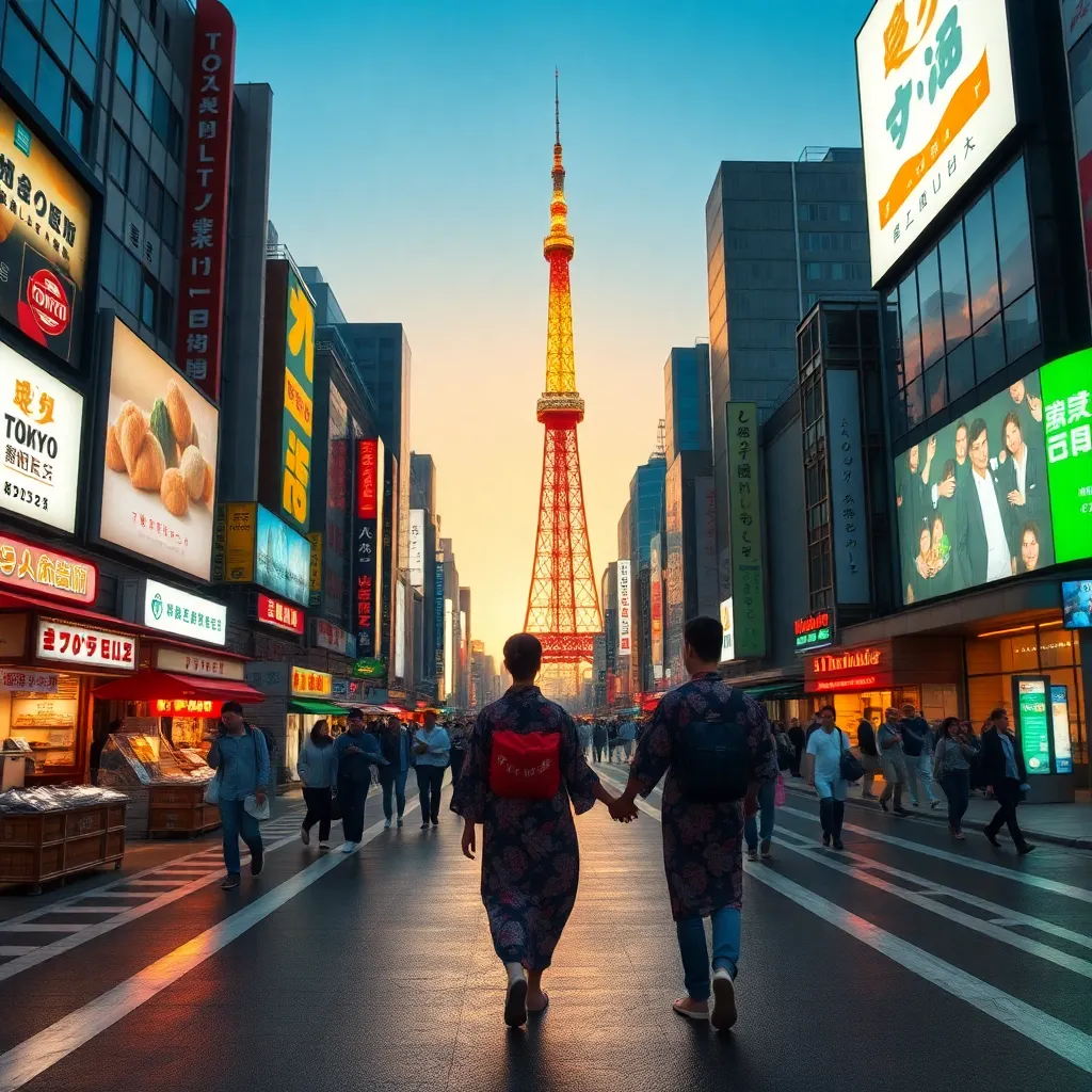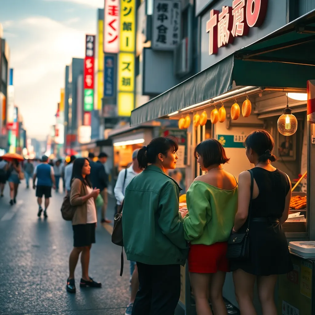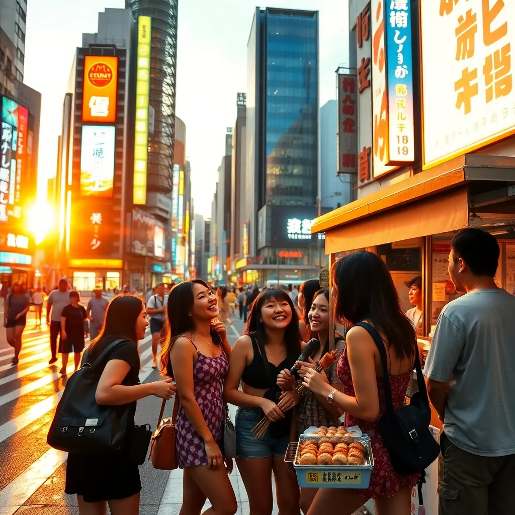 a warm sunset casts a golden glow on the bustling streets of Shibuya, where neon lights and billboards reflect off the wet pavement after a sudden rain shower. A group of friends, dressed in trendy summer outfits, gather at a street food stall, laughing and savoring the sweet aroma of grilled yakitori.