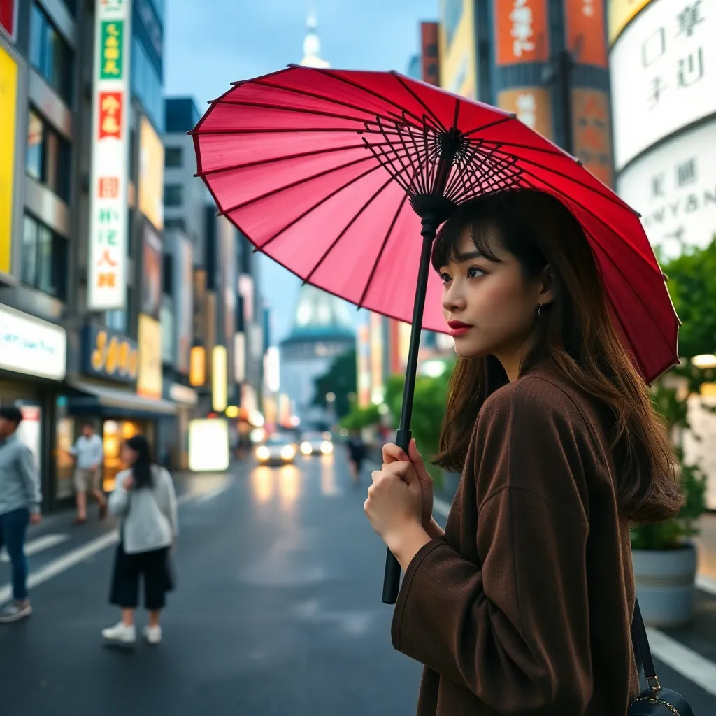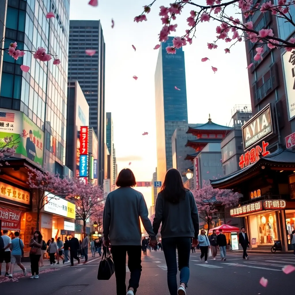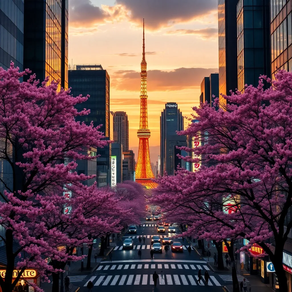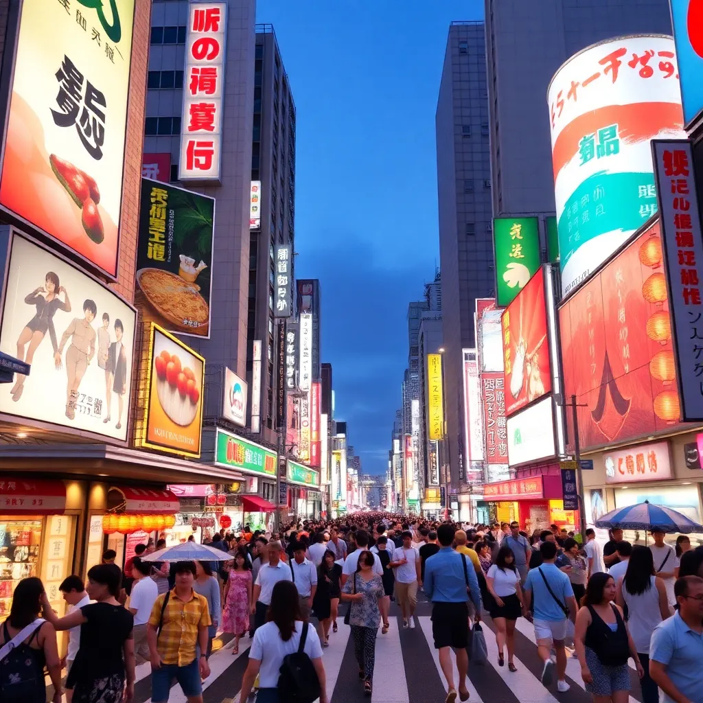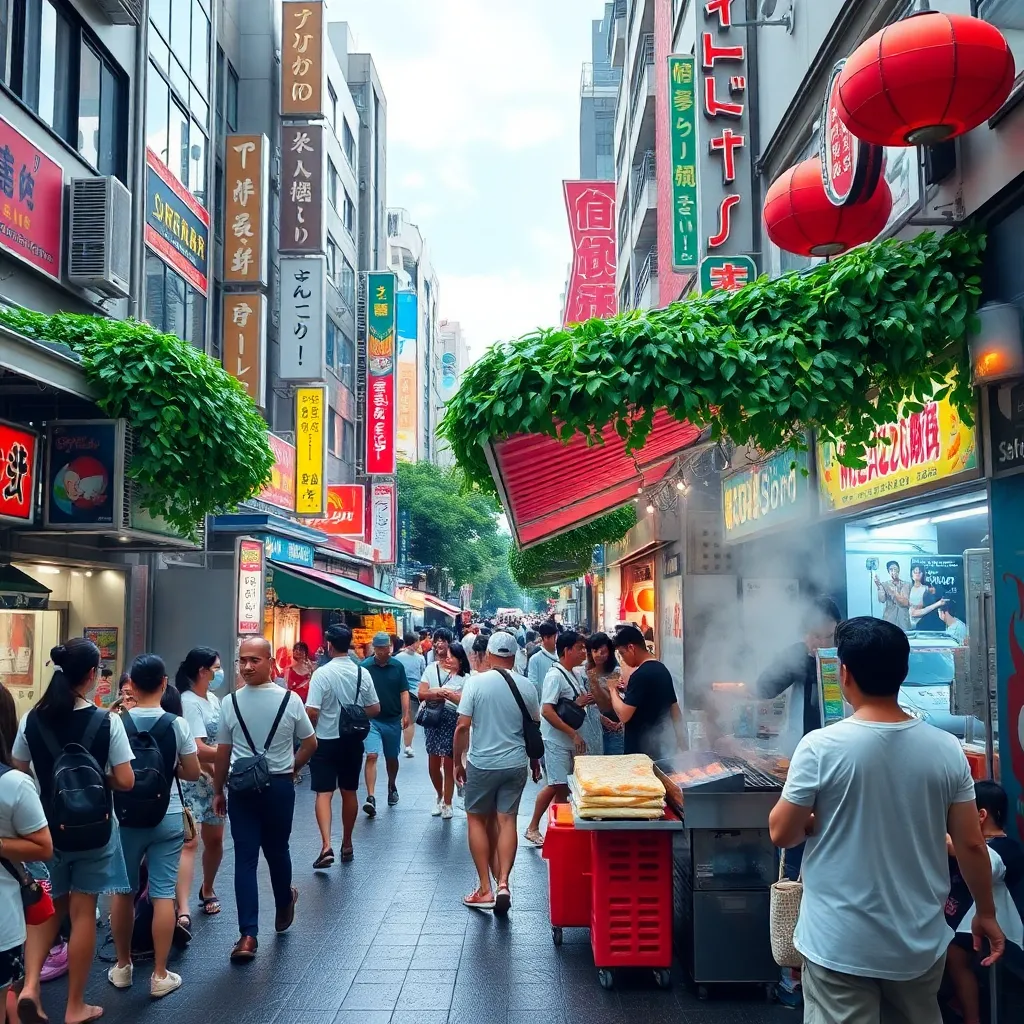 a warm sunset casts a golden glow on the bustling streets of Shibuya, where neon lights and billboards reflect off the wet pavement after a sudden rain shower. A group of friends, dressed in trendy summer outfits, gather at a street food stall, laughing and savoring the sweet aroma of grilled yakitori.