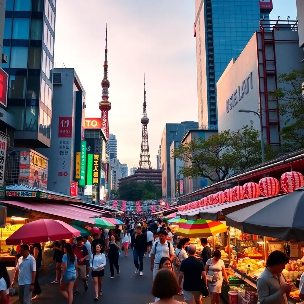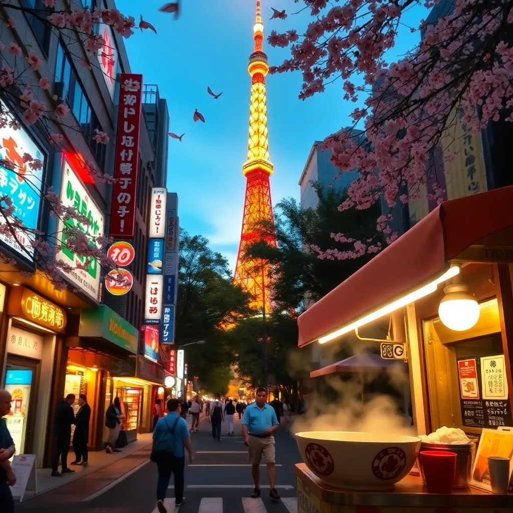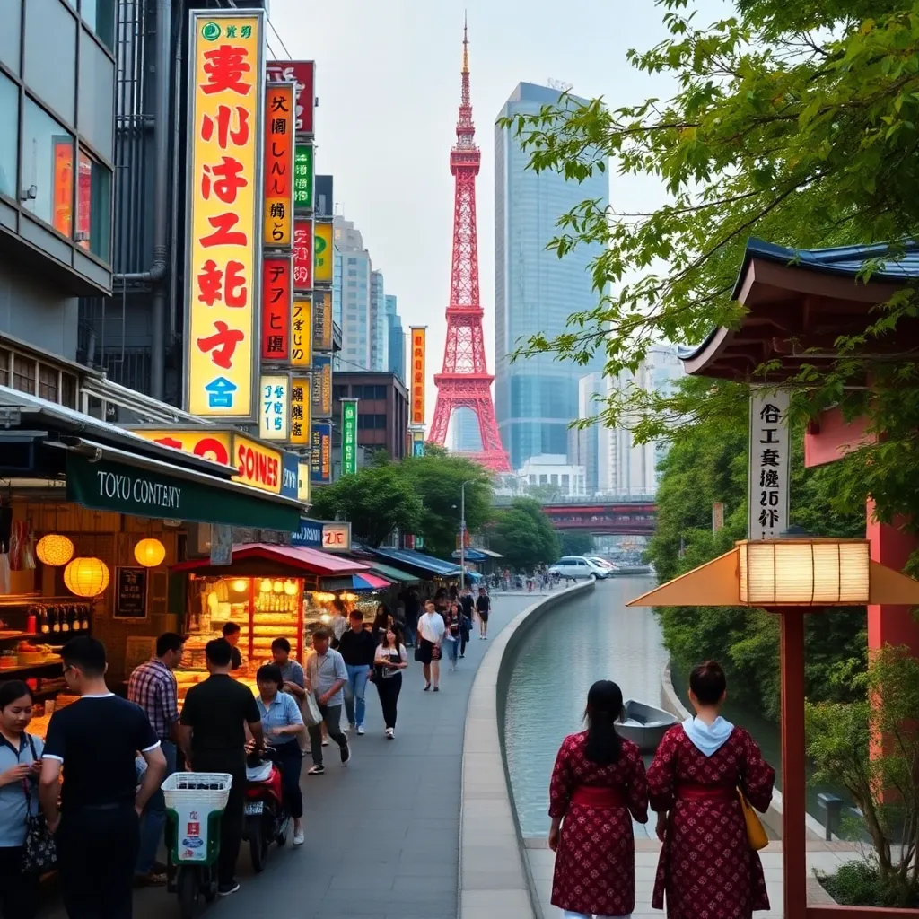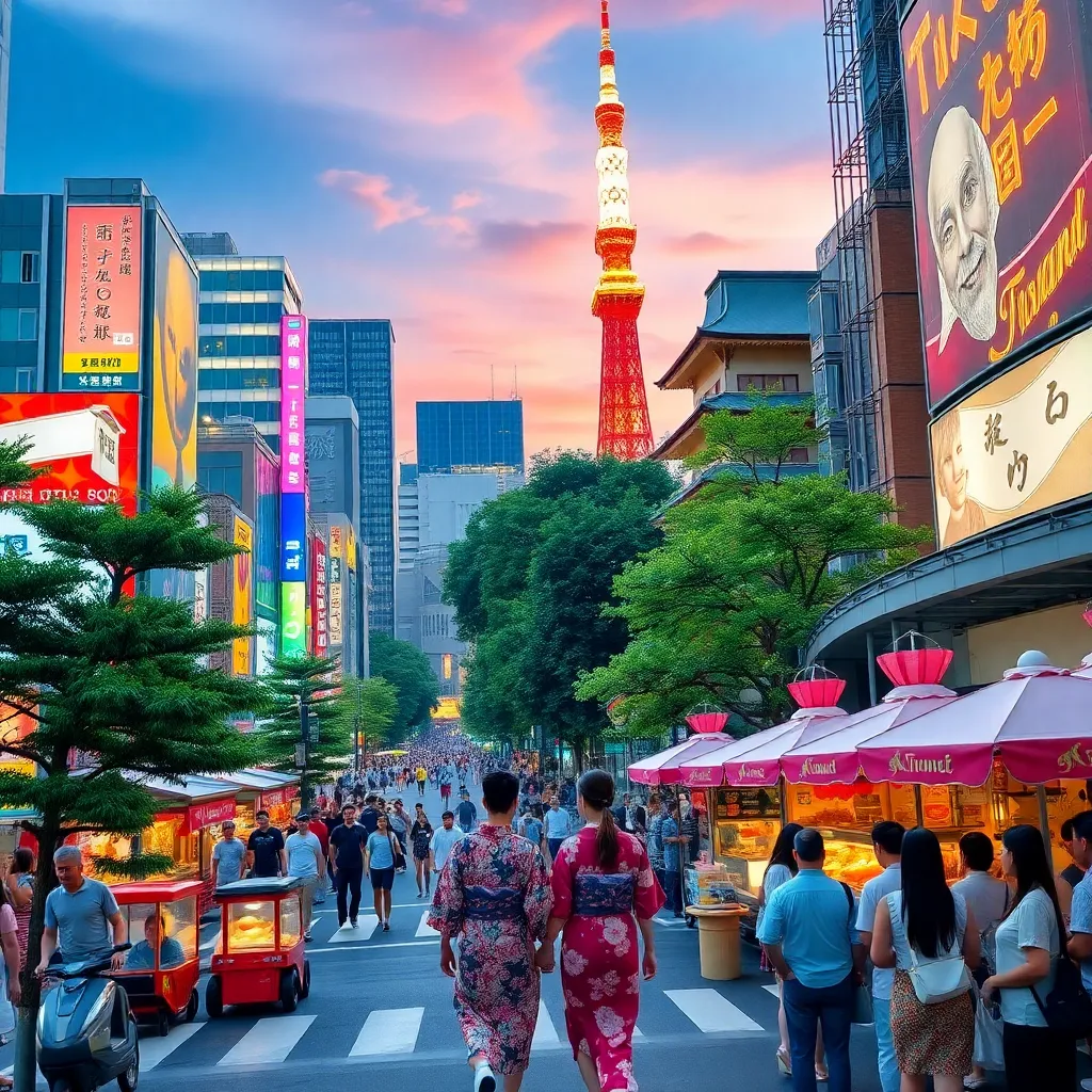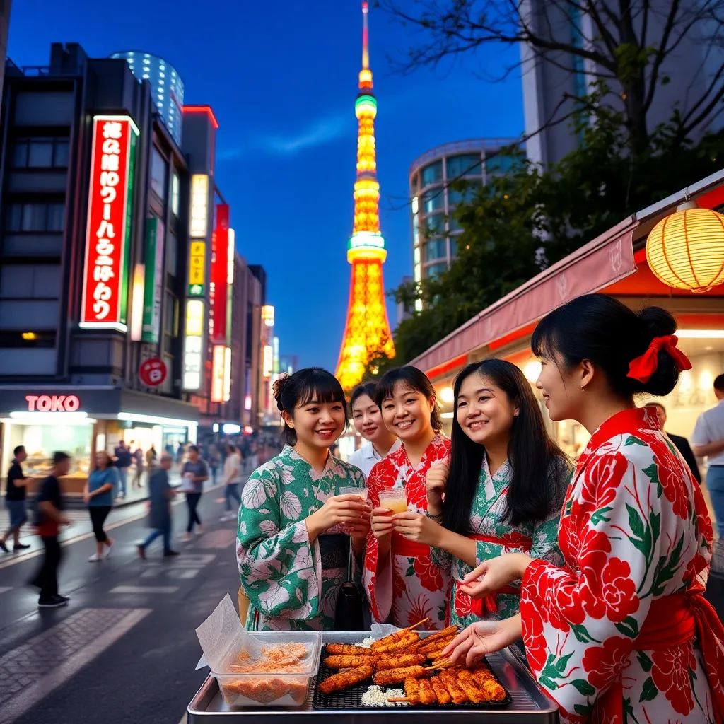 Capture the vibrant essence of Summer in Tokyo. Imagine a warm evening in the city, with neon lights reflecting off the Sumida River. A group of friends, dressed in colorful yukatas, gather around a street food stall, savoring fresh yakitori and laughing together. The Tokyo Tower stands tall in the background.