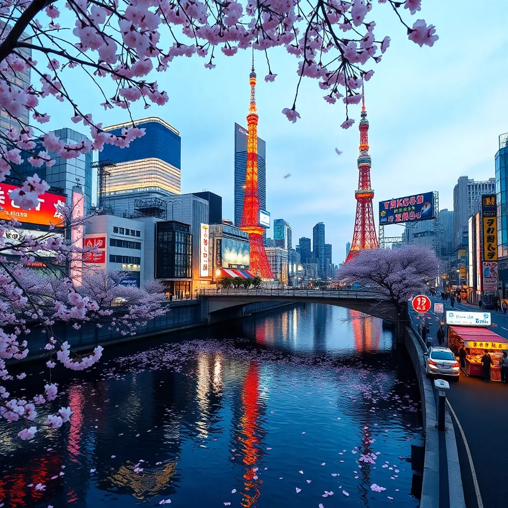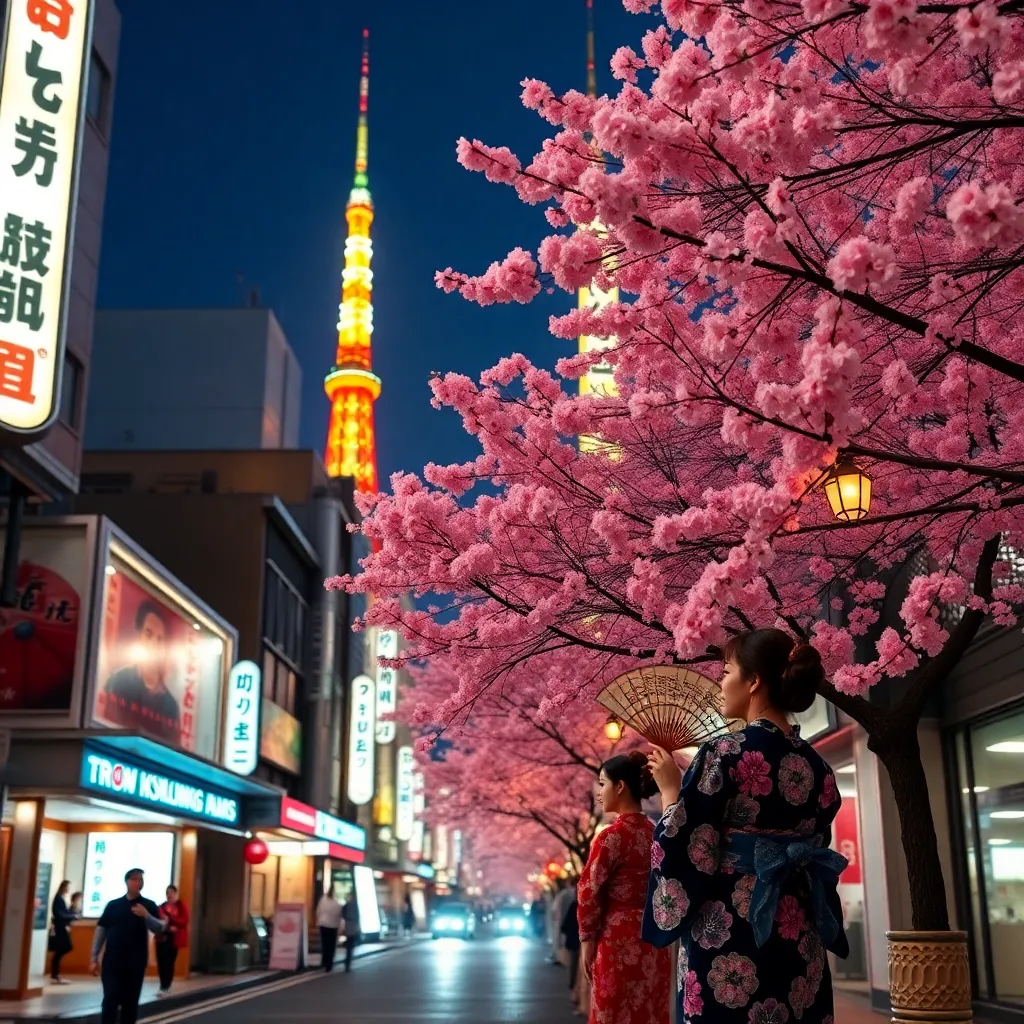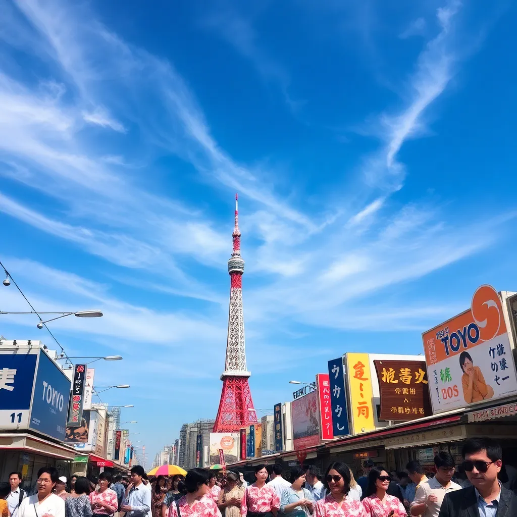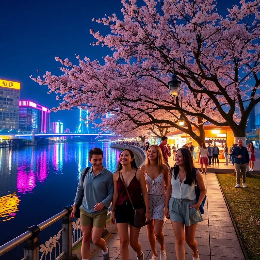 Capture the vibrant essence of Summer in Tokyo. Imagine a warm evening in the city, with neon lights reflecting off the Sumida River. A group of friends, dressed in colorful yukatas, gather around a street food stall, savoring fresh yakitori and laughing together. The Tokyo Tower stands tall in the background.