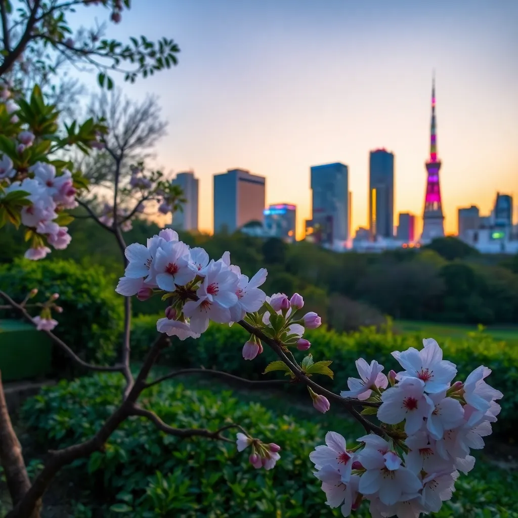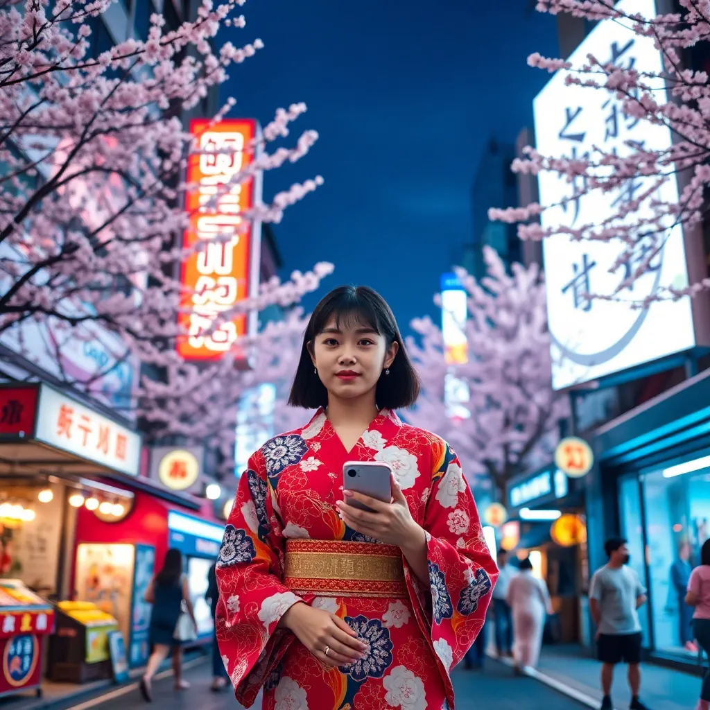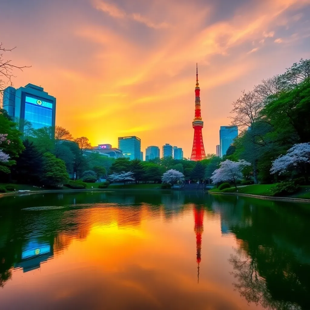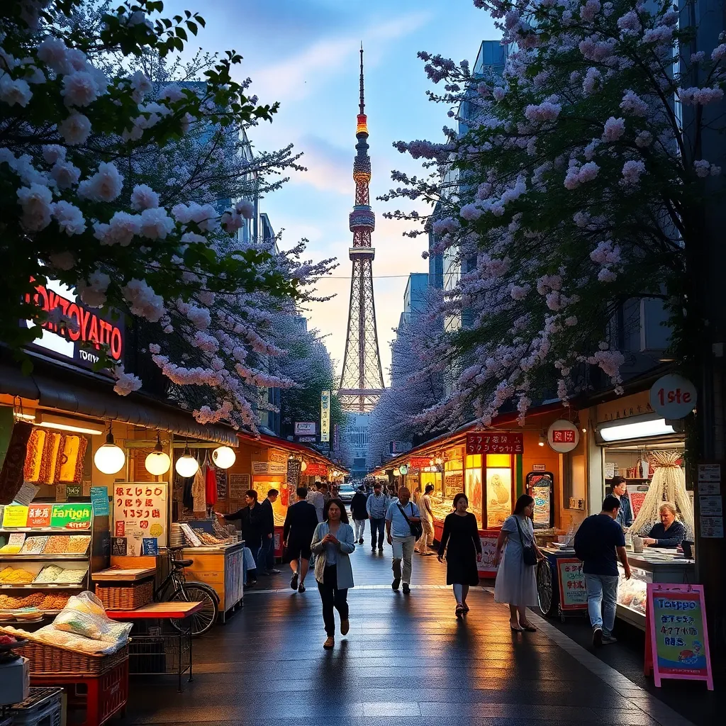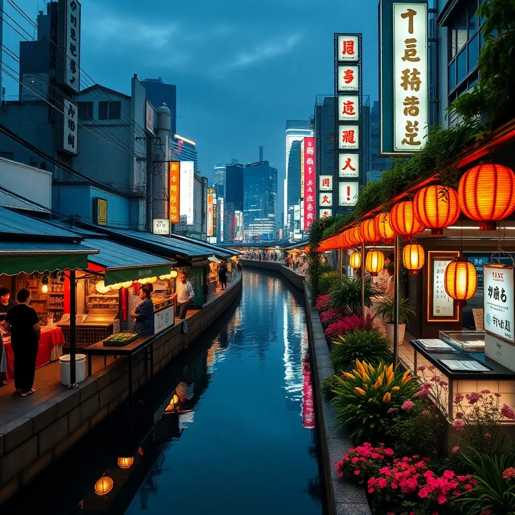 Capture the vibrant essence of Summer in Tokyo. Imagine a warm evening in the city, with neon lights reflecting off the Sumida River. A group of friends, dressed in colorful yukatas, gather around a street food stall, savoring fresh yakitori and laughing together. The Tokyo Tower stands tall in the background.