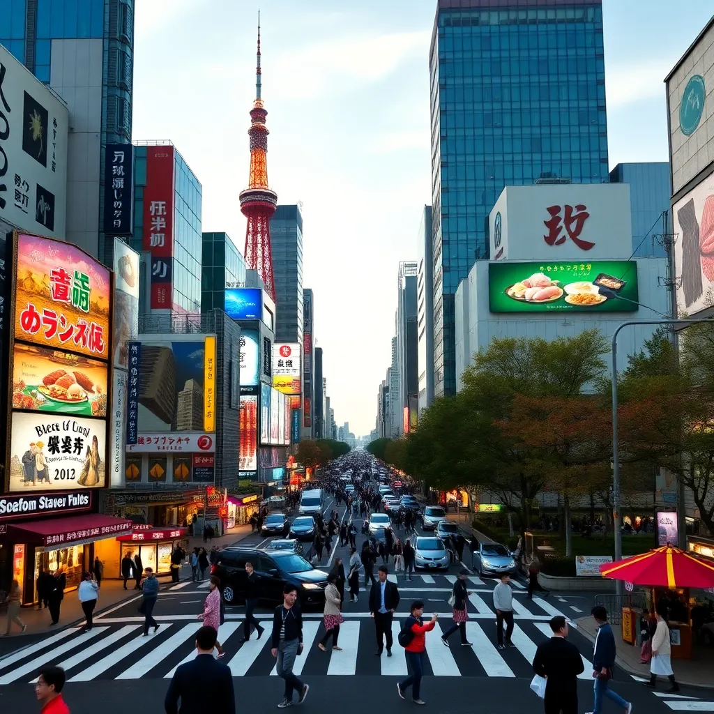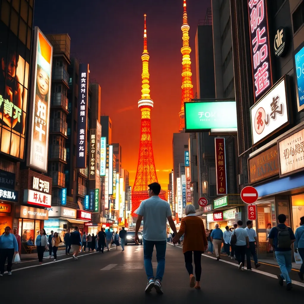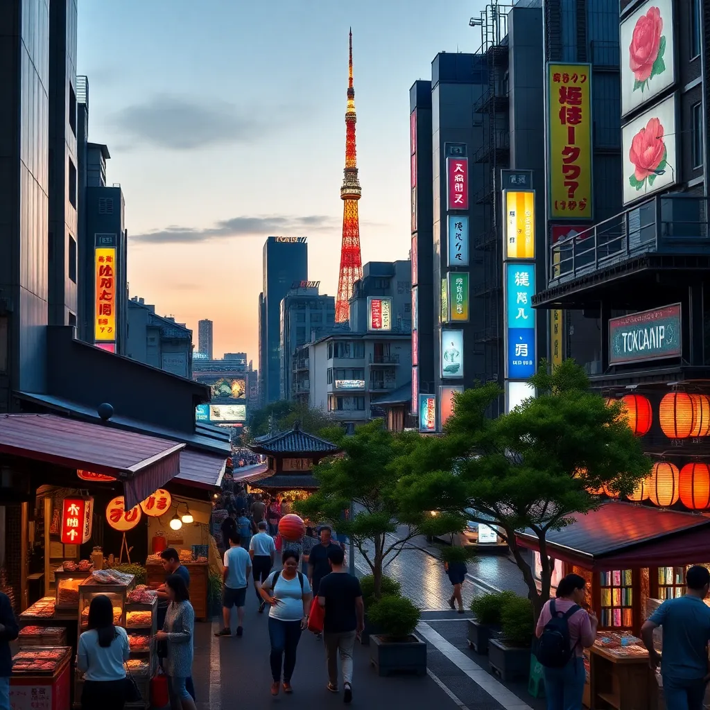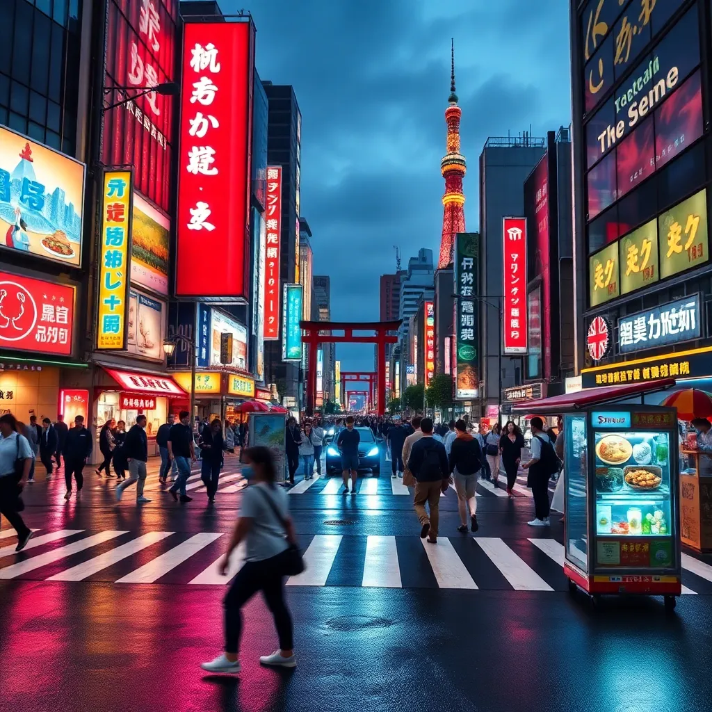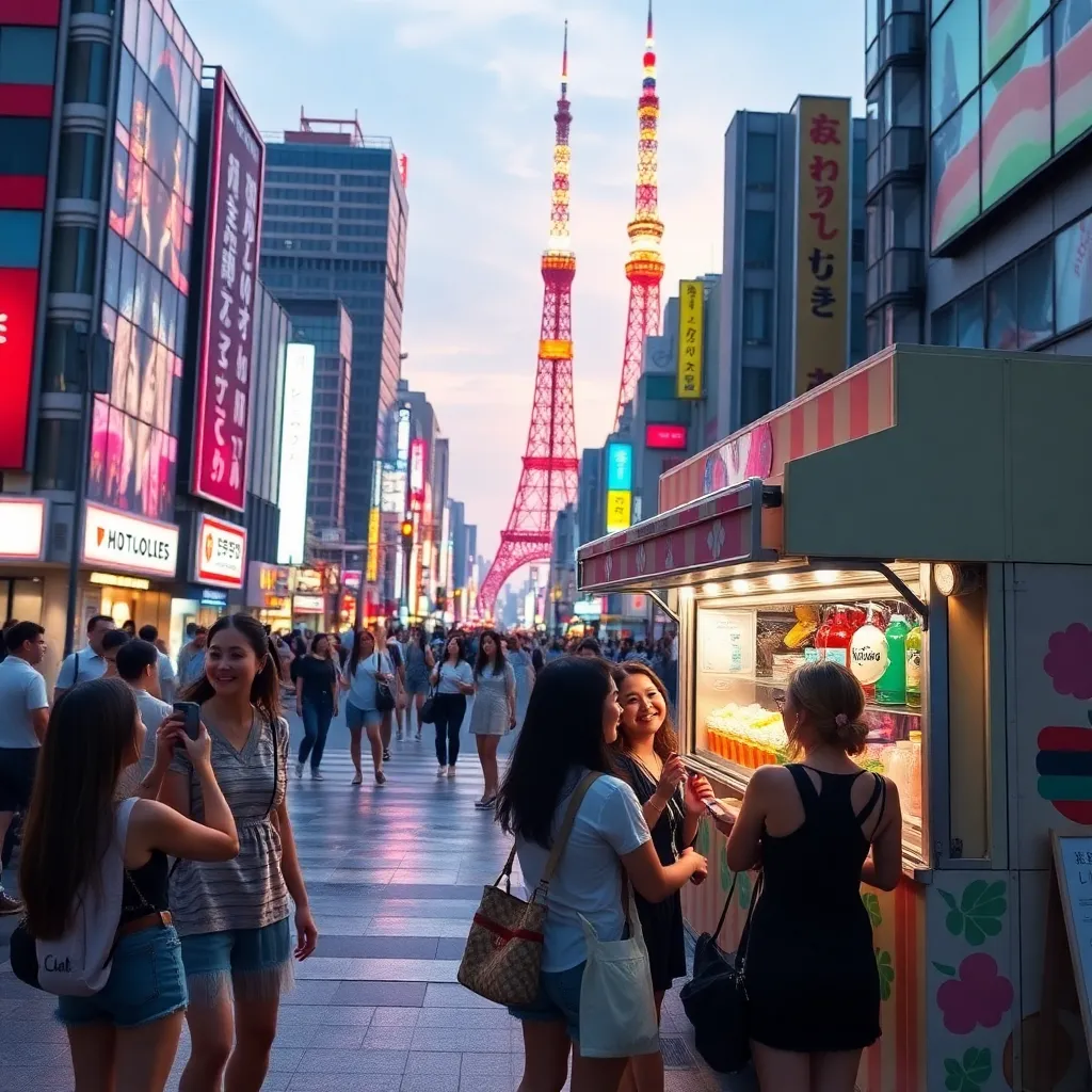 Capture the vibrant essence of a Tokyo summer evening. Imagine a bustling Shibuya Crossing, neon lights reflecting off wet pavement, and the Tokyo Tower looming in the distance. A group of friends, laughing and taking selfies, gather around a colorful food truck serving refreshing summer treats. What does this scene look like?
