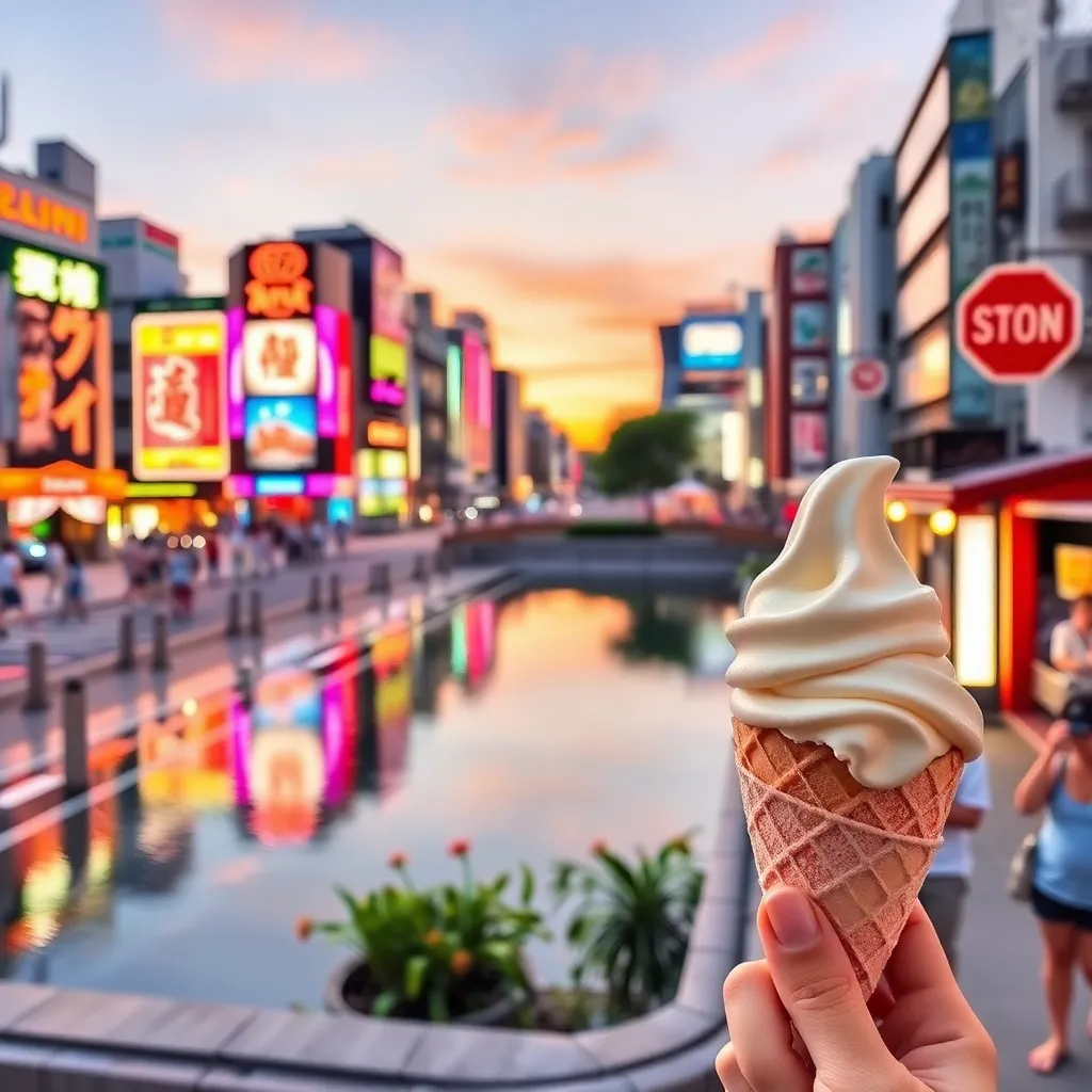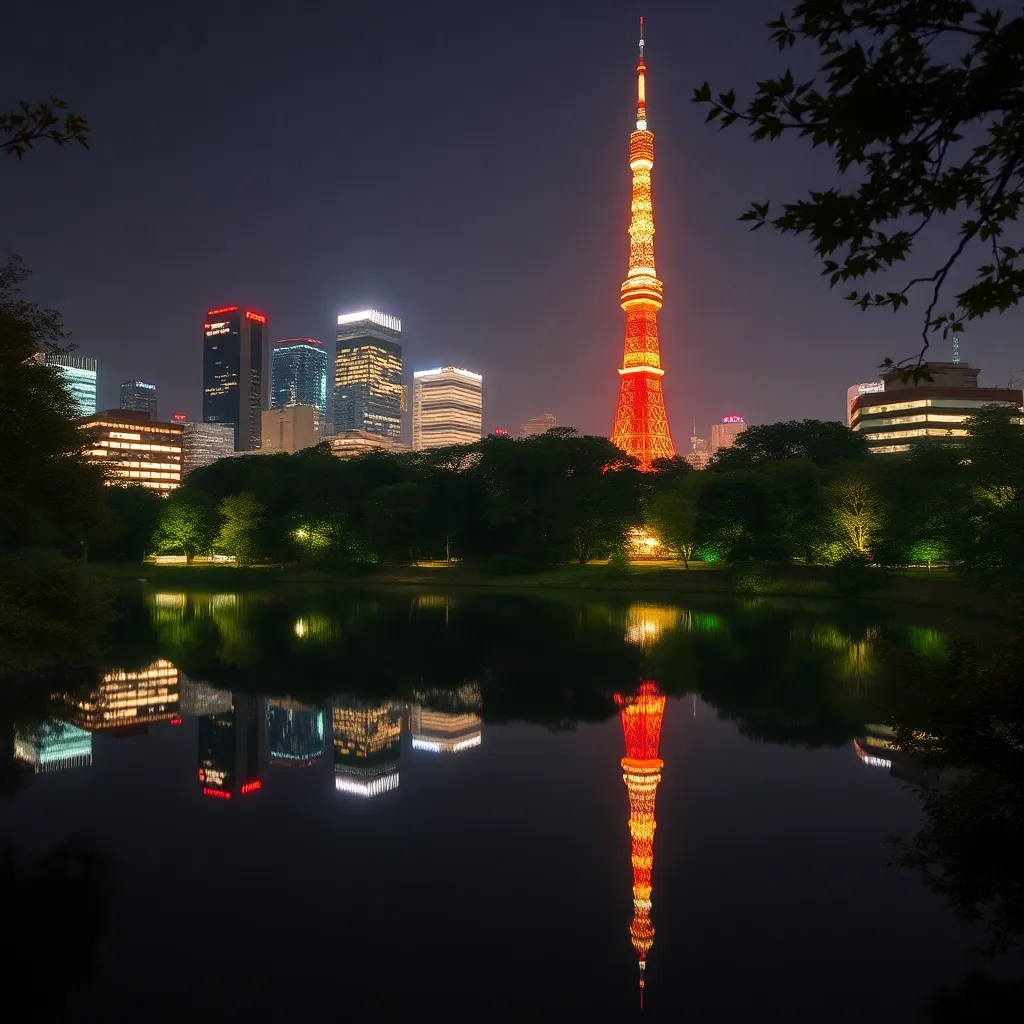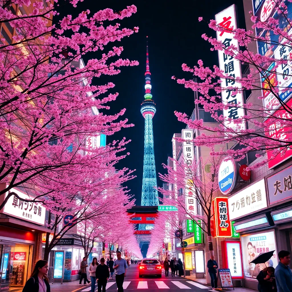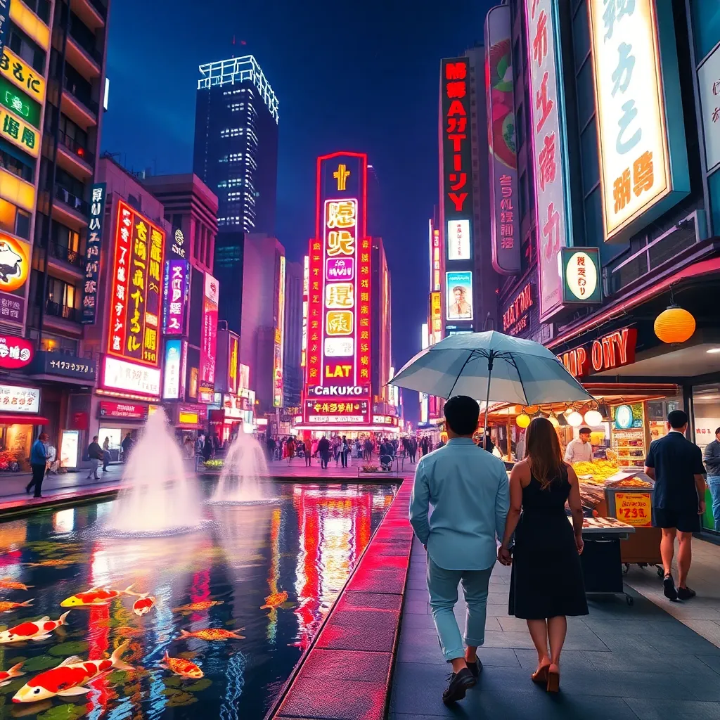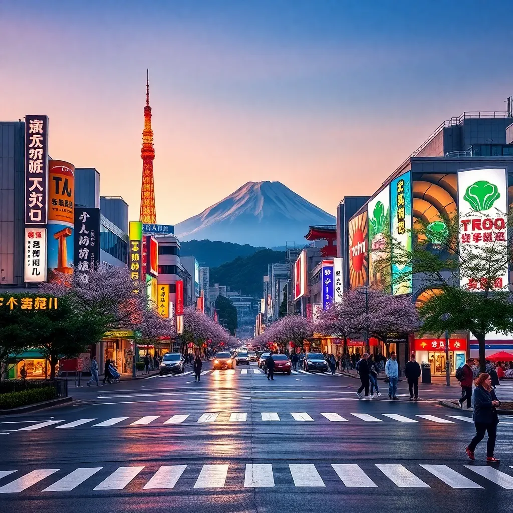 Capture the vibrant essence of a Tokyo summer evening. Imagine a bustling Shibuya Crossing, neon lights reflecting off wet pavement, and the Tokyo Tower looming in the distance. A group of friends, laughing and taking selfies, gather around a colorful food truck serving refreshing summer treats. What does this scene look like?