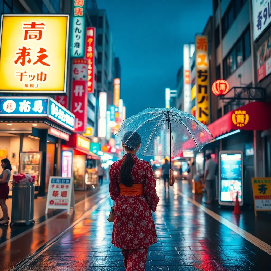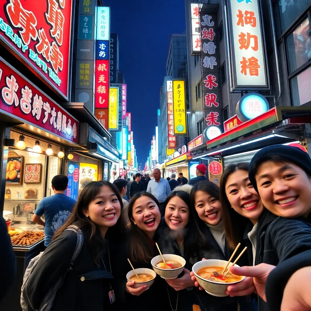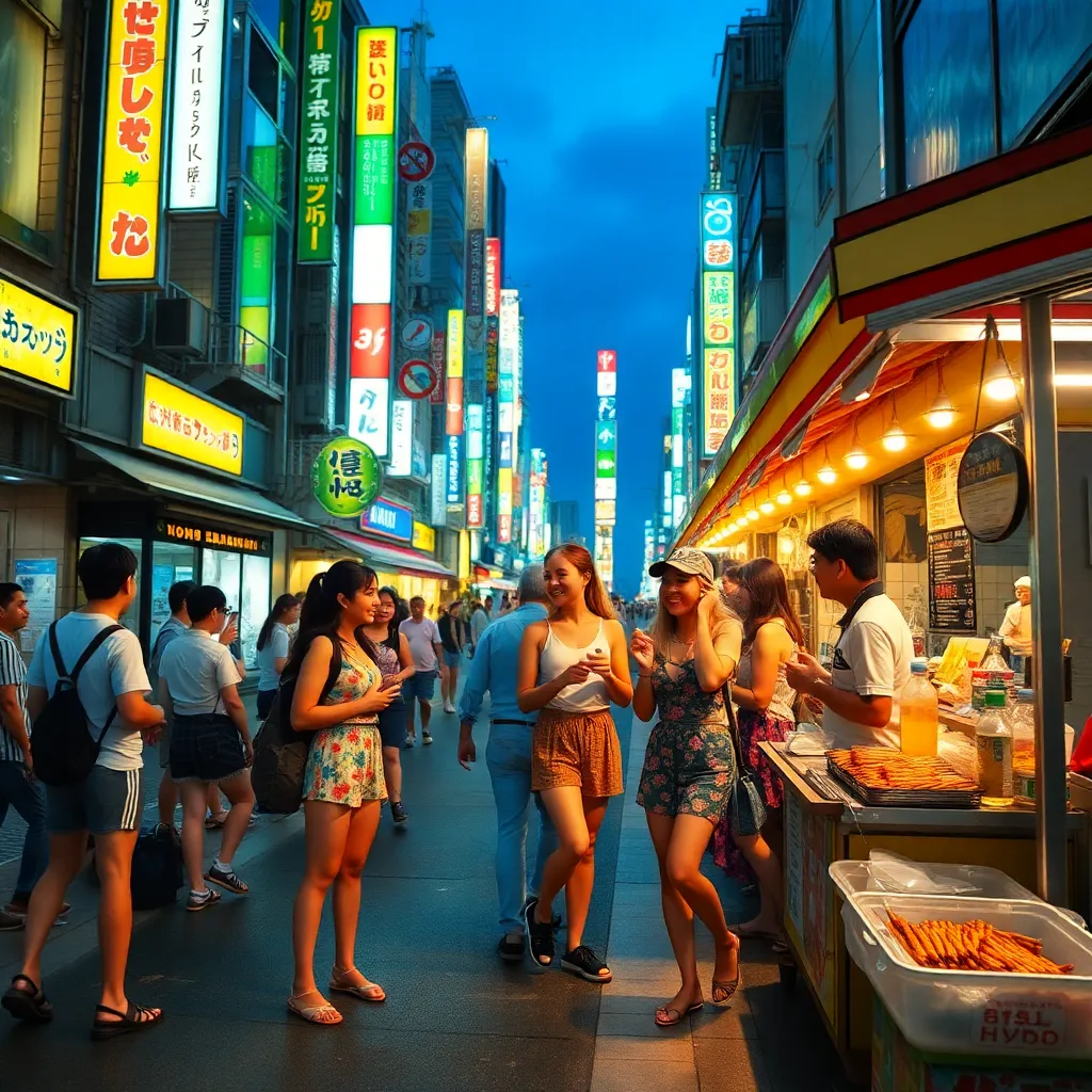 Capture the vibrant essence of a Tokyo summer evening. Imagine a bustling street in Shinjuku, neon lights reflecting off wet pavement, and the sounds of laughter and chatter filling the air. A group of friends, dressed in colorful summer outfits, gather around a street food stall, enjoying yakitori and cold beers.