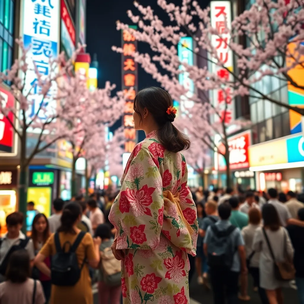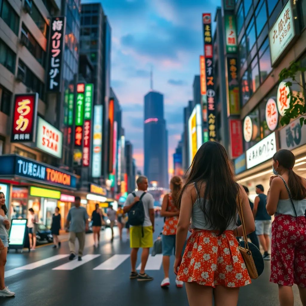 Capture the vibrant essence of a Tokyo summer evening. Imagine a bustling street in Shibuya, neon lights reflecting off wet pavement, and the scent of street food wafting through the air. A group of friends, dressed in colorful summer outfits, gather around a street performer as the sun sets behind the towering skyscrapers.